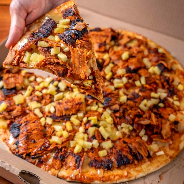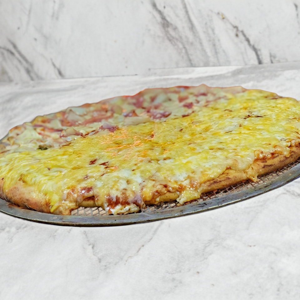 Masa delgada con base de salsa de tomate y queso mozzarella, con Jamon de pavo y piña horneada al carbon