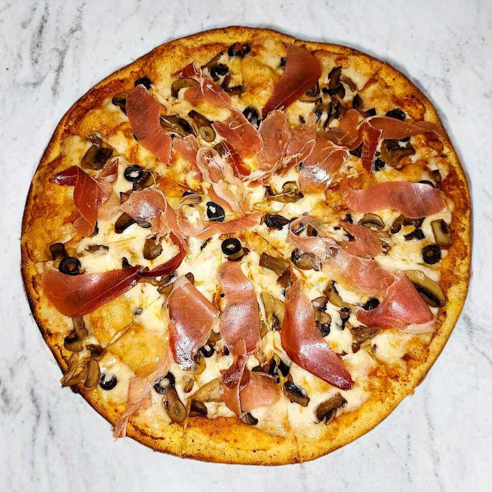 Base de masa delgada con salsa de tomate, queso mozarella, champiñones, aceitunas negras y jamon serrano
