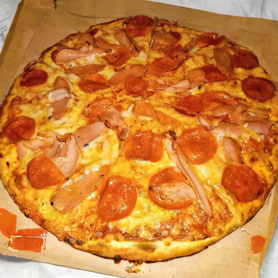Masa delgada con base de salsa de tomate y queso mozzarella, peperoni, salchicha y Jamon