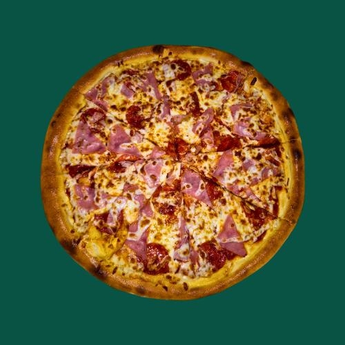 salsa, queso mozzarela, pepperoni, jamón, tocino y chorizo
