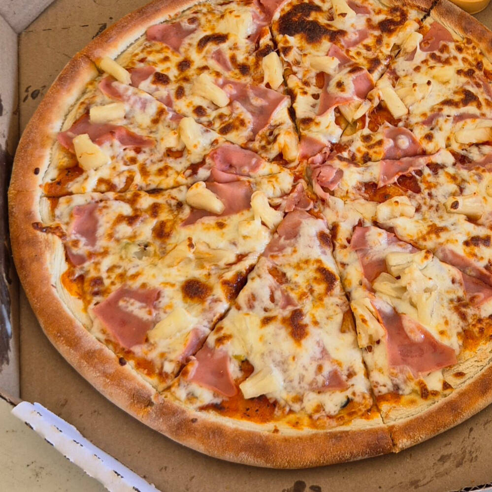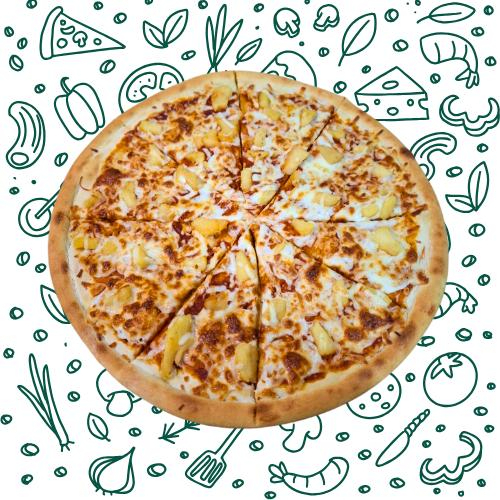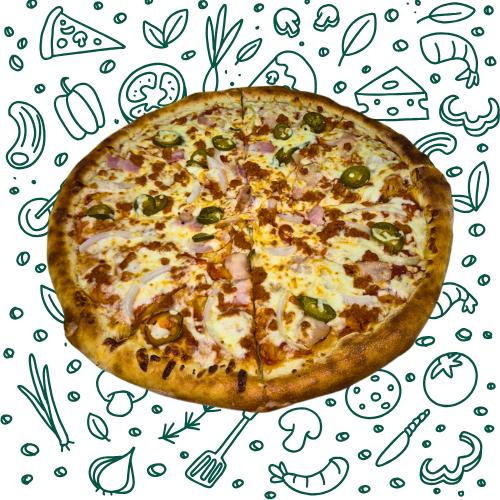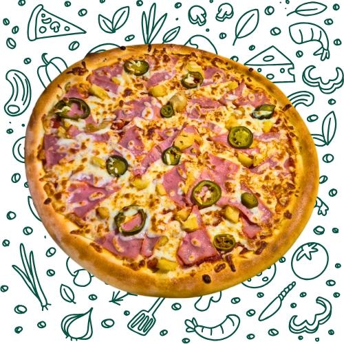salsa, queso mozzarella, jamón, piña, tocino y jalapeño