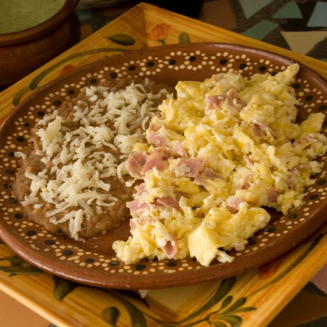 Huevos Revueltos Con Jamón, Acompañado Con Frijoles Refritos, Tortilla Nixtamalizada Y Salsa Aparte