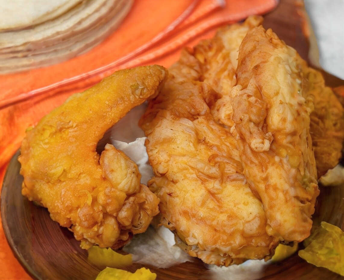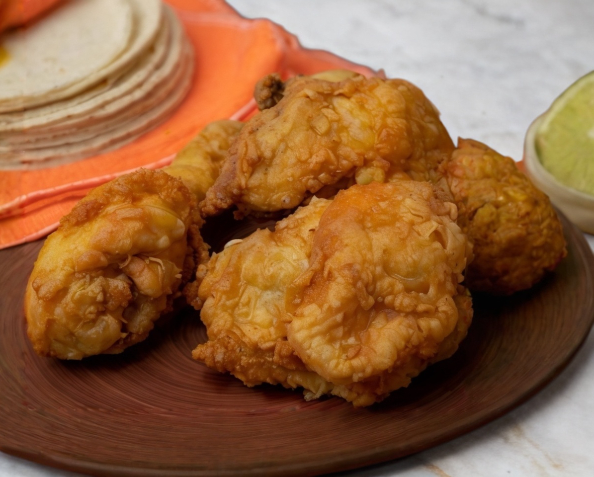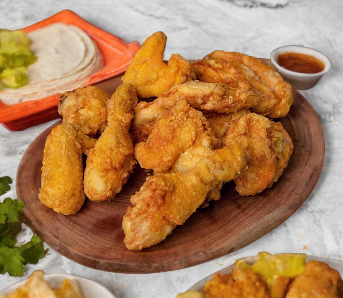 Un pollo 1 pollo frito partido en 10 pz con 300 gr de tortillas de maiz y 100 ml de salsa.