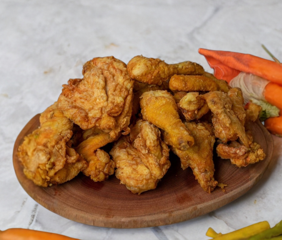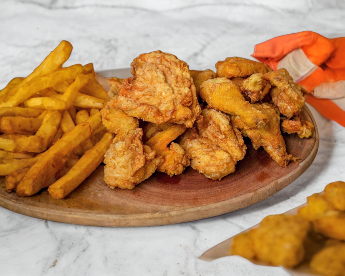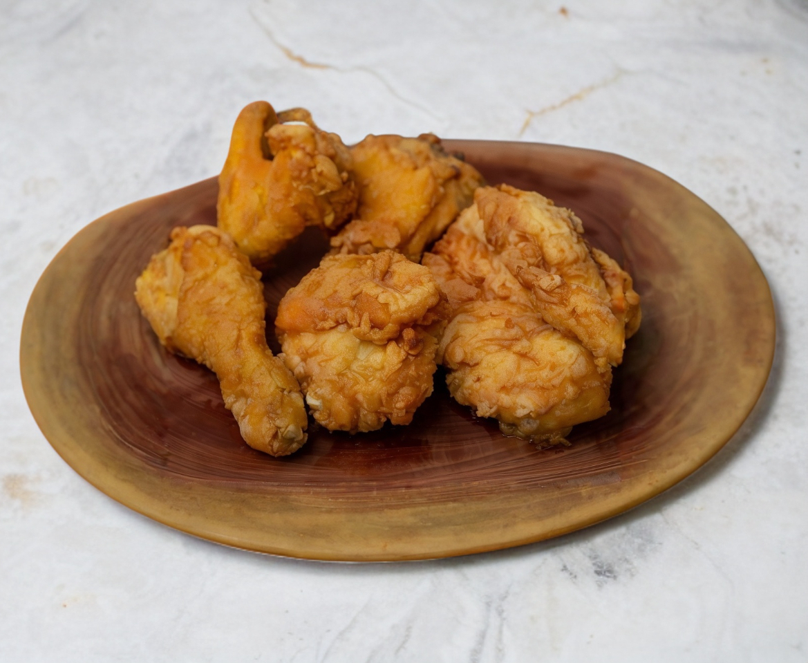 Un pollo 1 pollo frito partido en 10 pz con 300 gr de tortillas de maiz y 100 ml de salsa.
