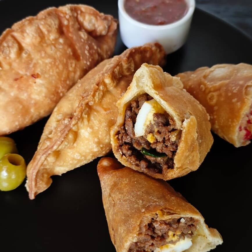 6 empanadas Argentinas, sabores a elegir entre: carne tradicional, jamón con queso, peperoni con queso, o carne al pastor con queso. Acompañadas de salsa picante.