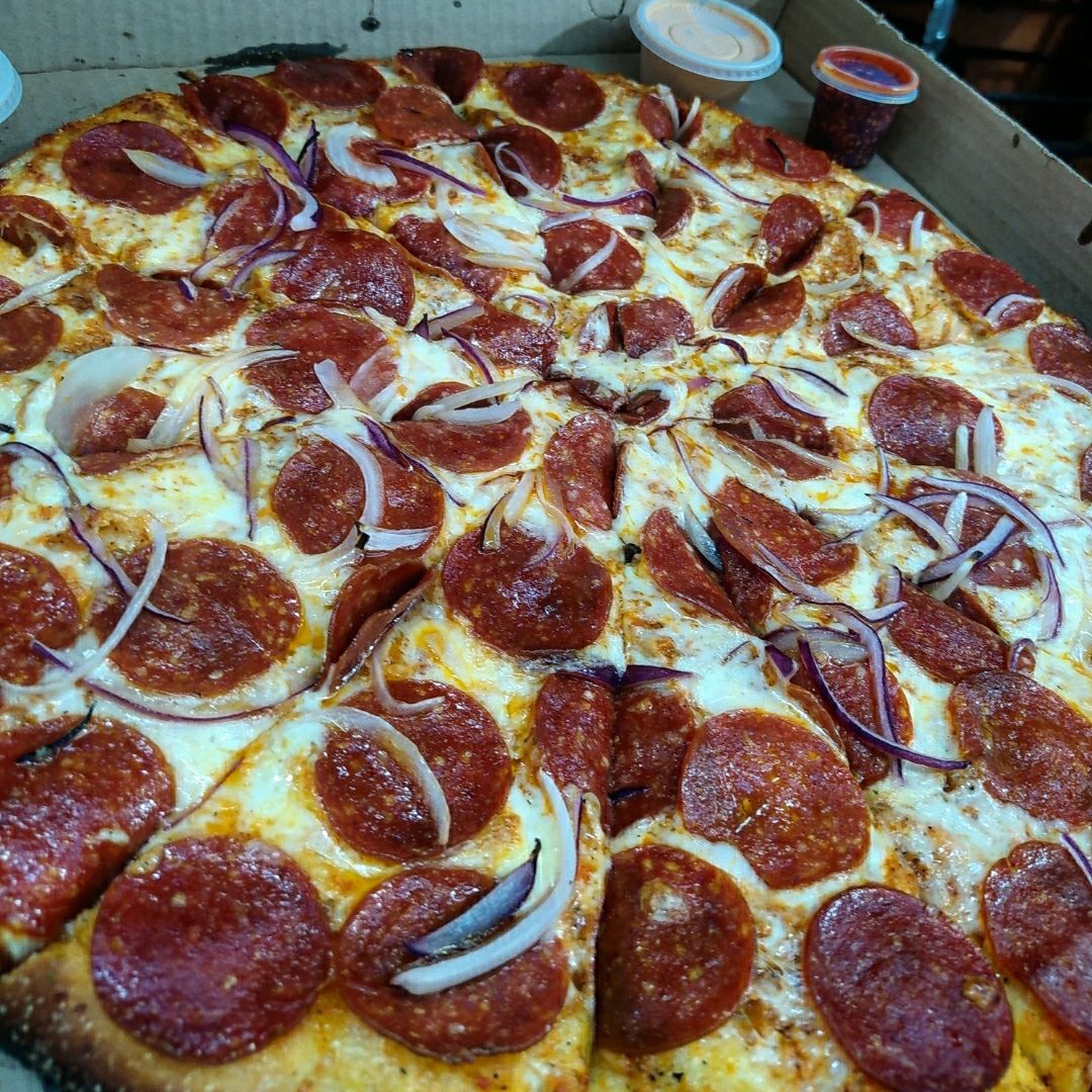Salsa pomodoro, Mozarella, Pepperoni, Cebolla morada