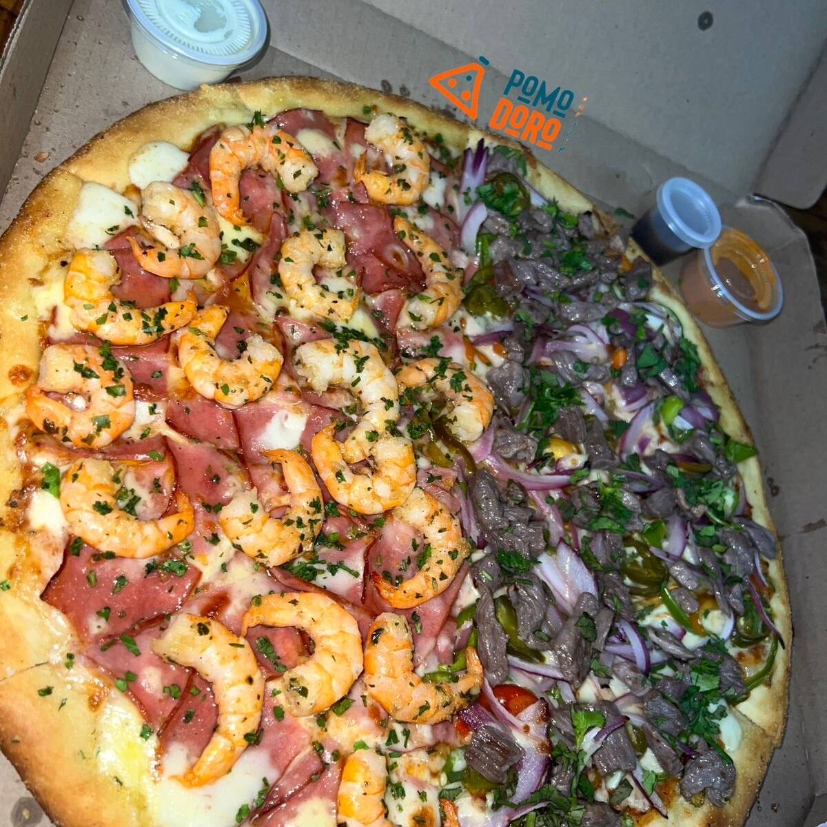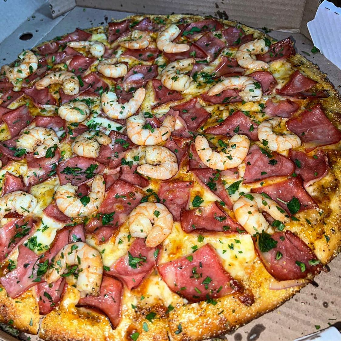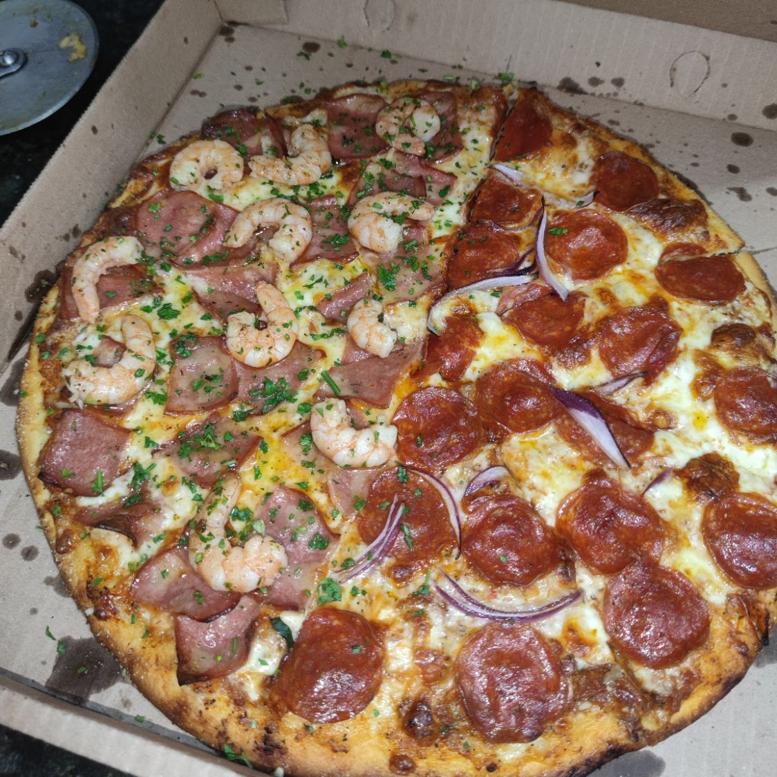 salsa pomodoro, mozarella, tocino, perejil, camarones salteados al ajo, pepperoni, cebolla blanca picada