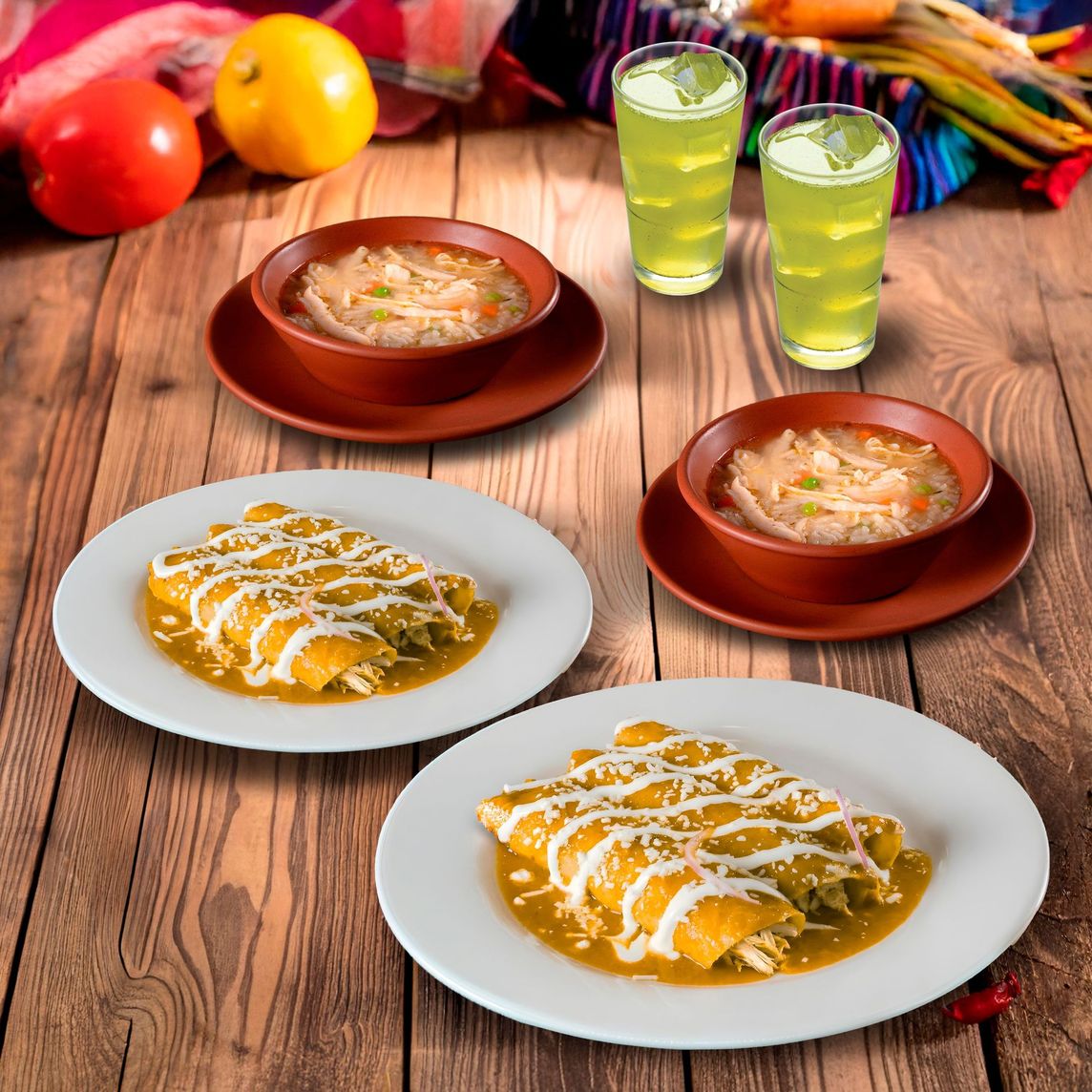 Incluye 2 sopas de fideo o consomé, 2 enchiladas rojas o verdes y 2 bebidas.