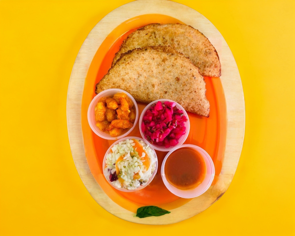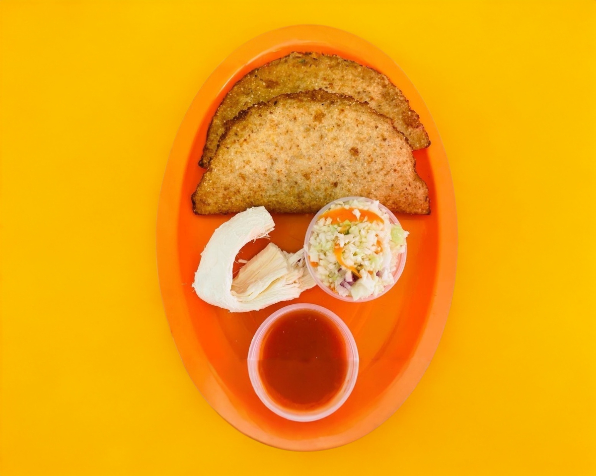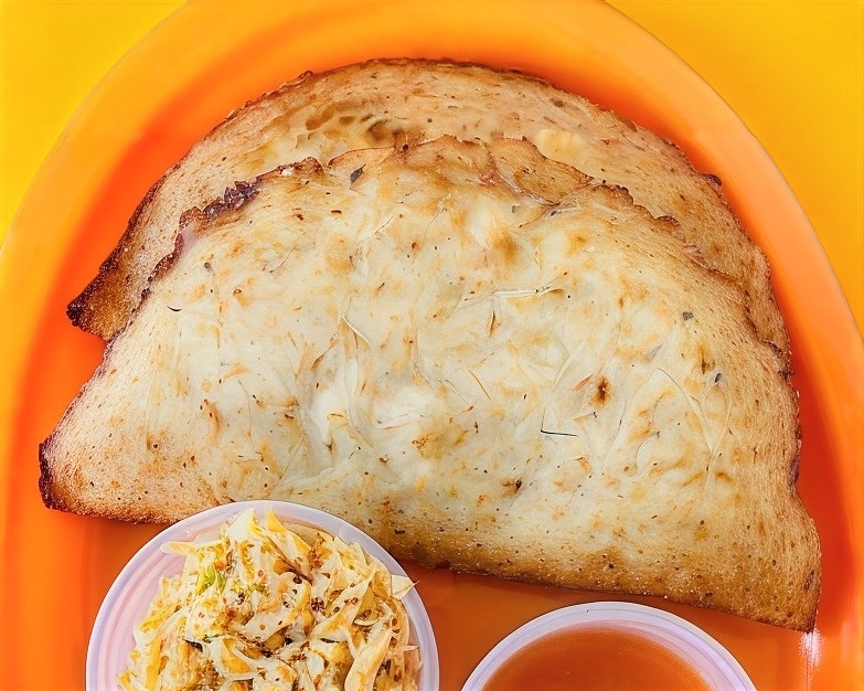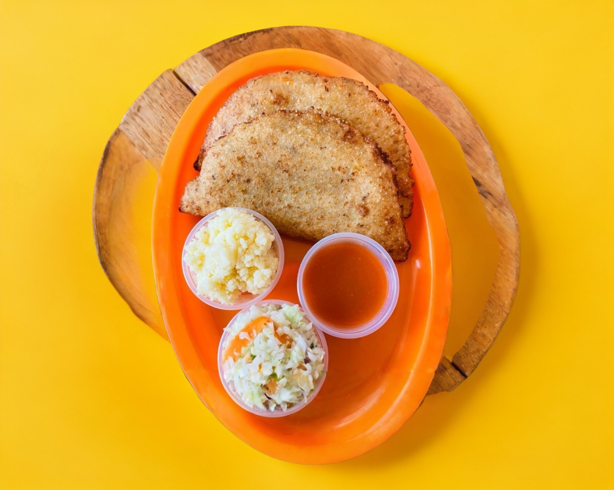 Es una empanada mediana, acompañado de repollo, salsa de tomate y habanero.