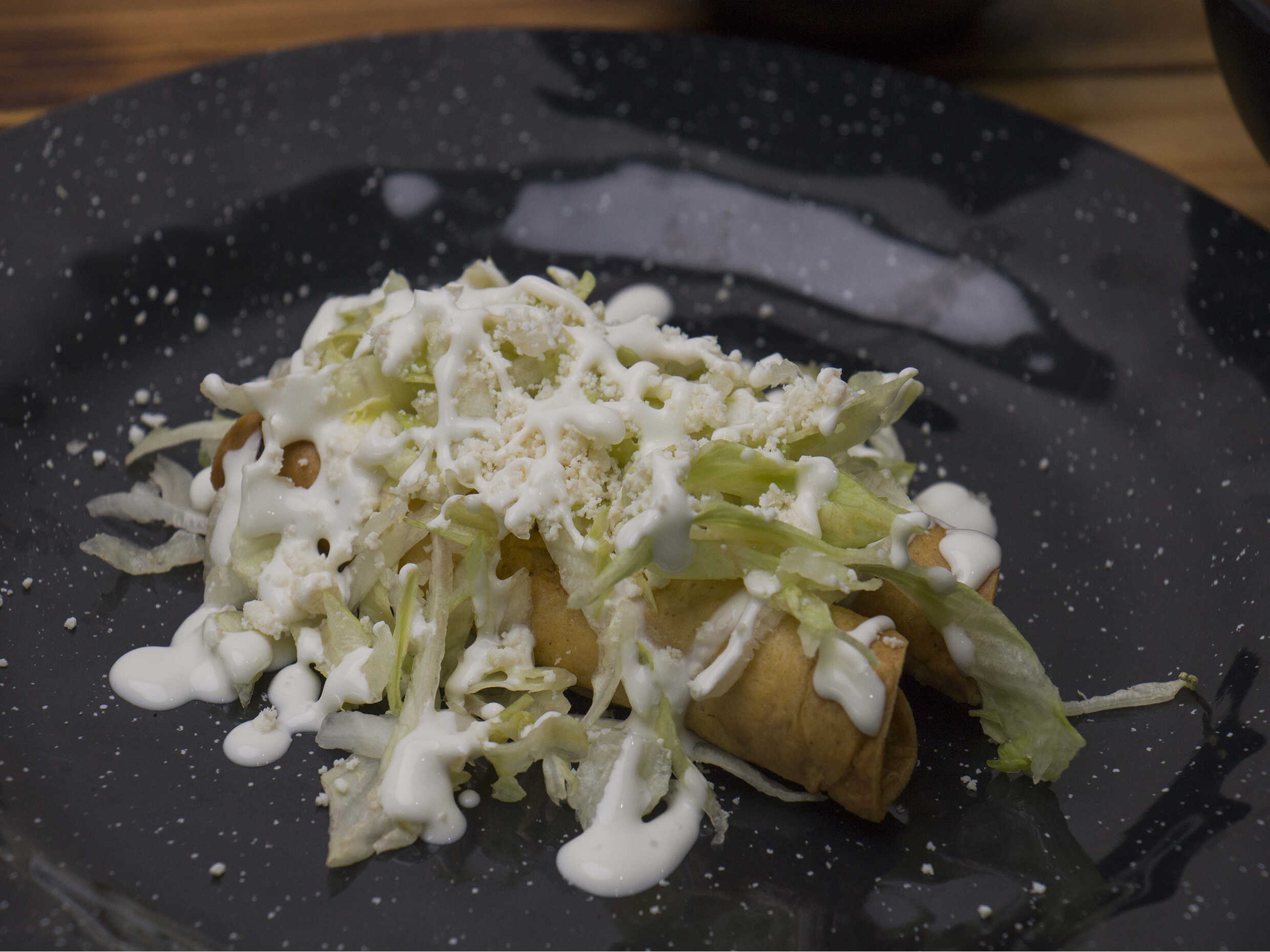 Orden de 5 tacos dorados rellenos de pollo acompañado de lechuga, queso crema y media crema