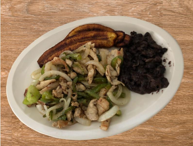 Fajitas de pollo acompañado de frijol y plátanos.