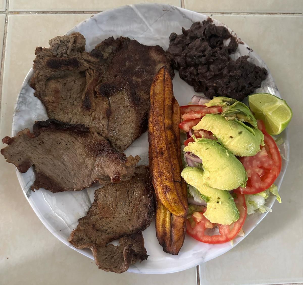 Fajitas de res acompañado de frijol y plátano frito.