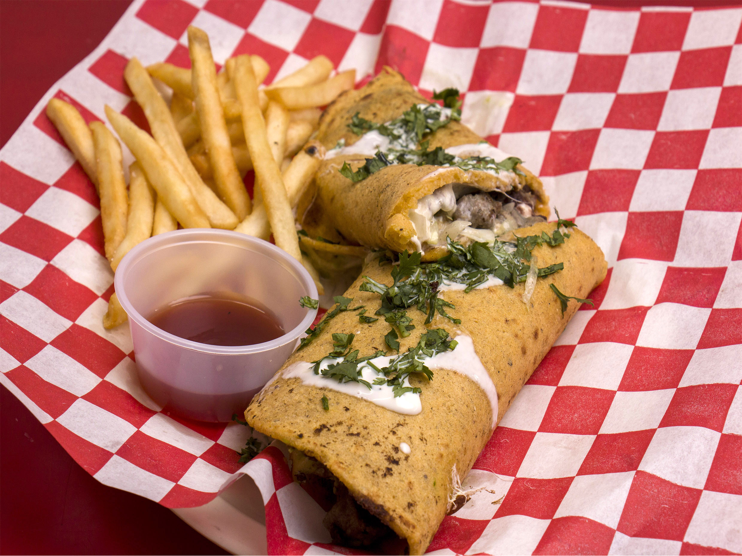 Tortilla de maíz de 30 cm hecha a mano, con frijol,queso de hebra,lechuga,tomate,cebolla,aguacate,media crema e ingrediente a elegir. Acompañada de papas a la francesa.