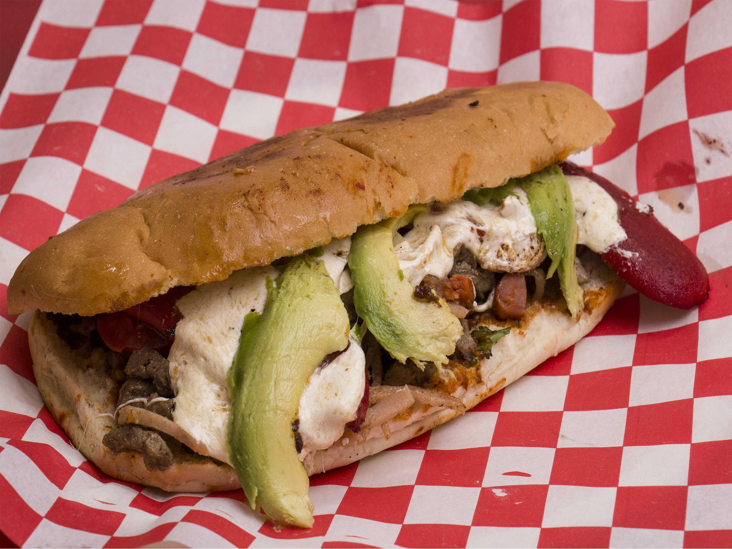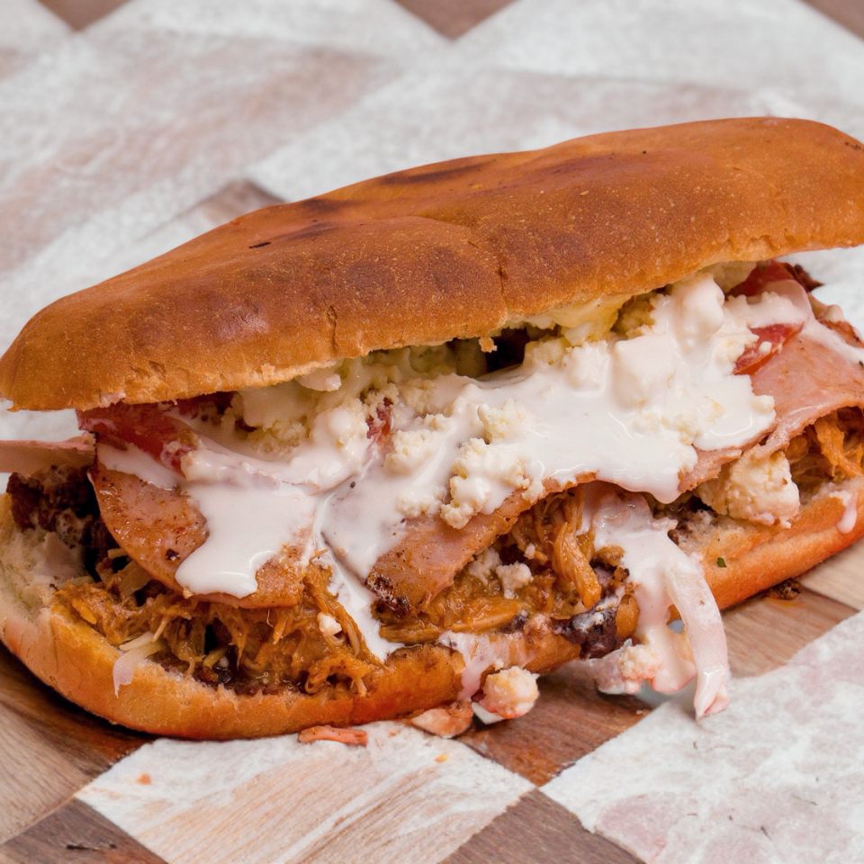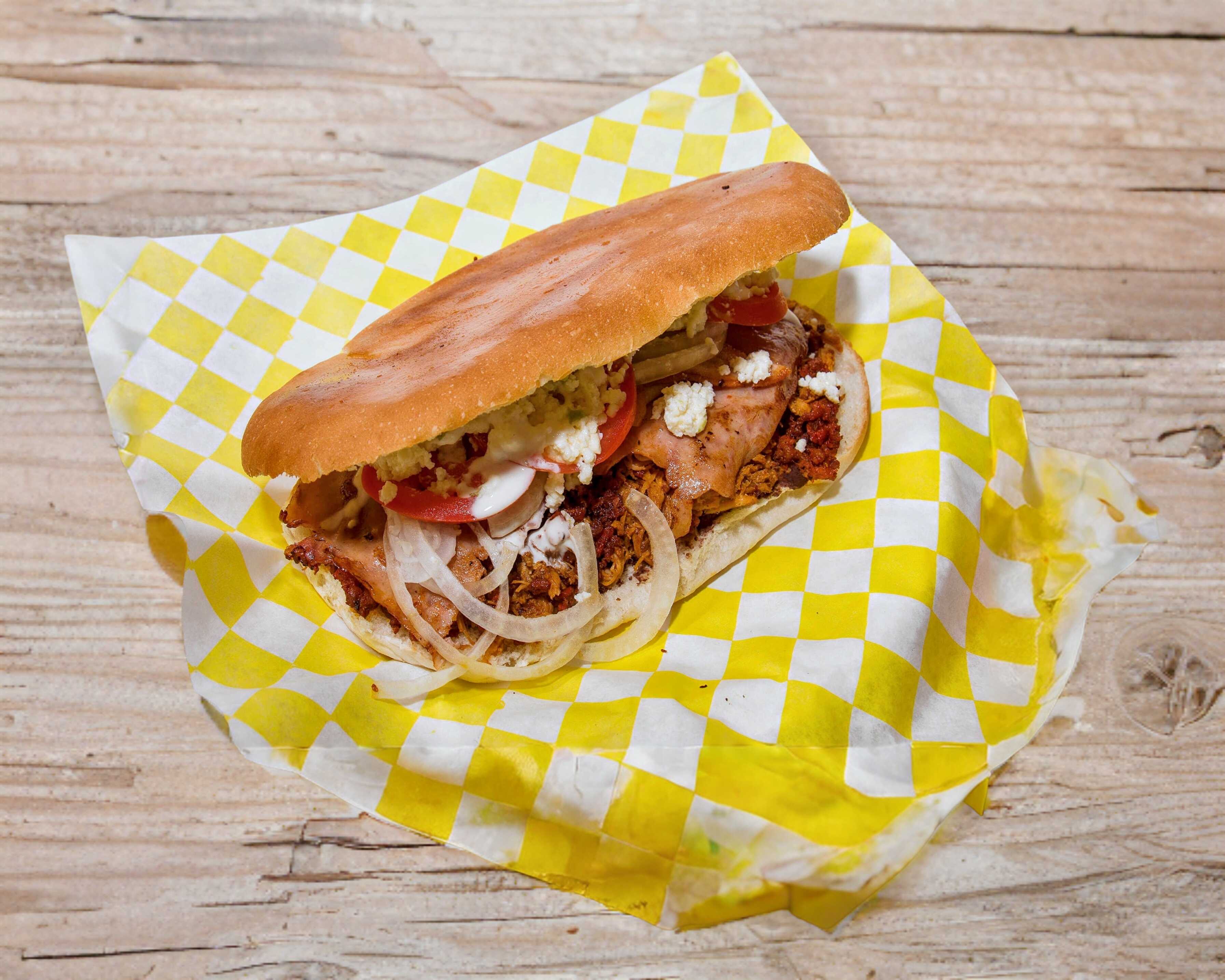 Pan, frijol, mayonesa, asada, salchicha alemana, chistorra, tocino, cebolla, tomate, queso de hebra y aguacate