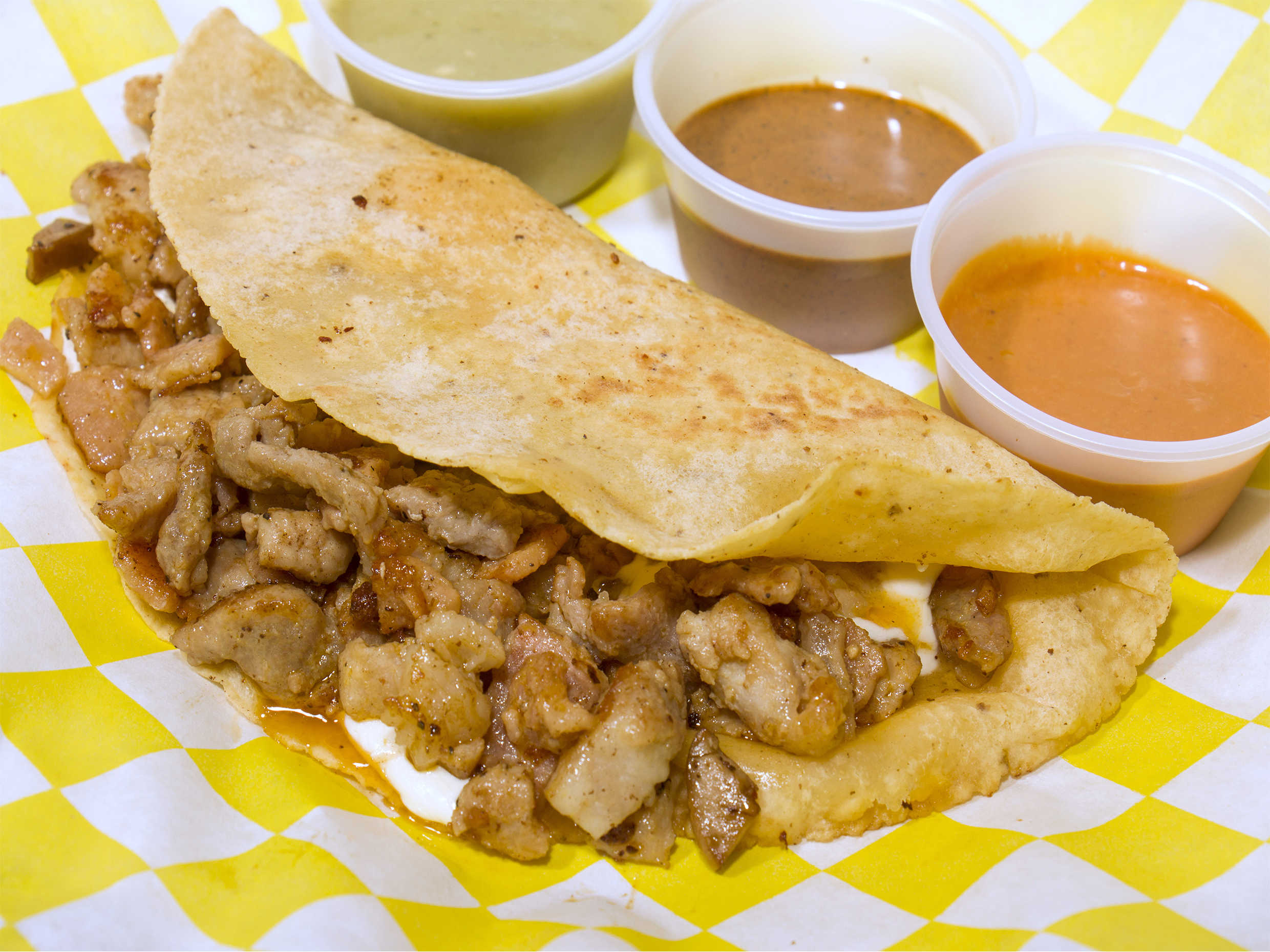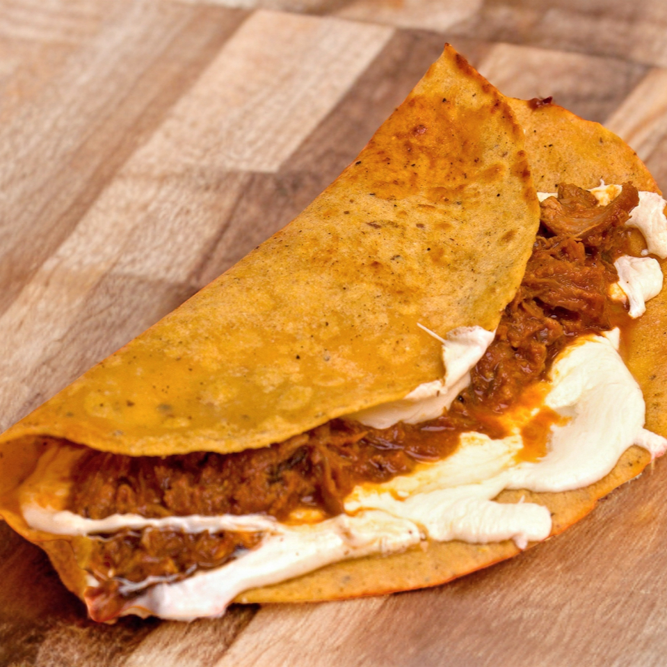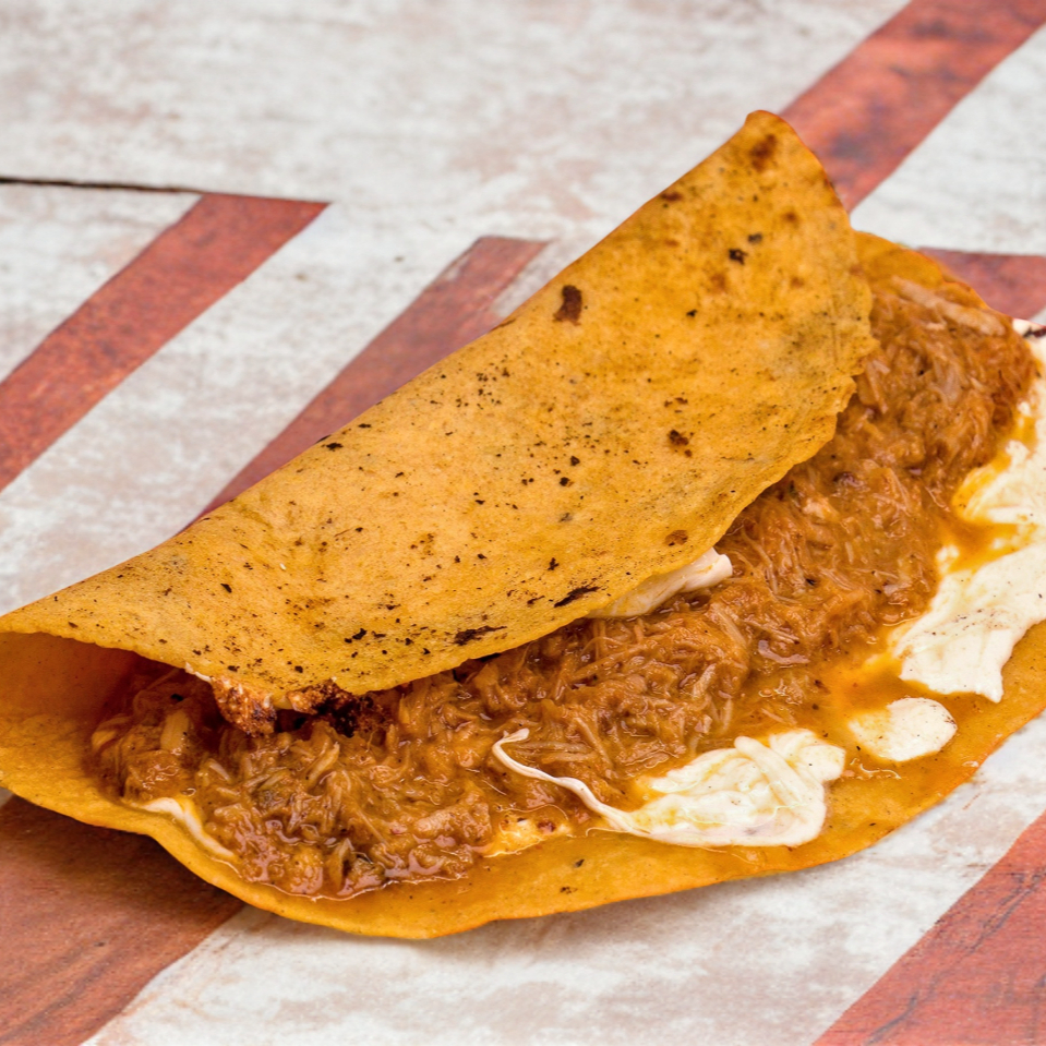 Tortilla hecha a a mano, queso de hebra y chicharrón prensado.