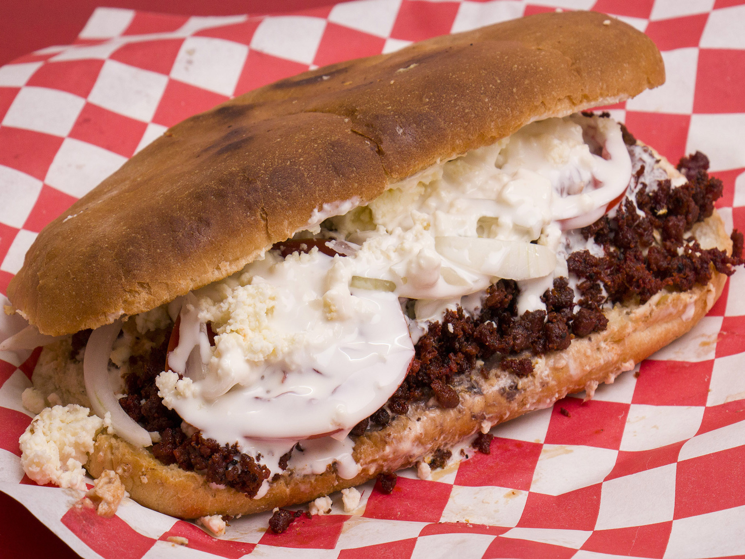 Pan, frijol, mayonesa, queso de hoja, cebolla, tomate, crema y chorizo.