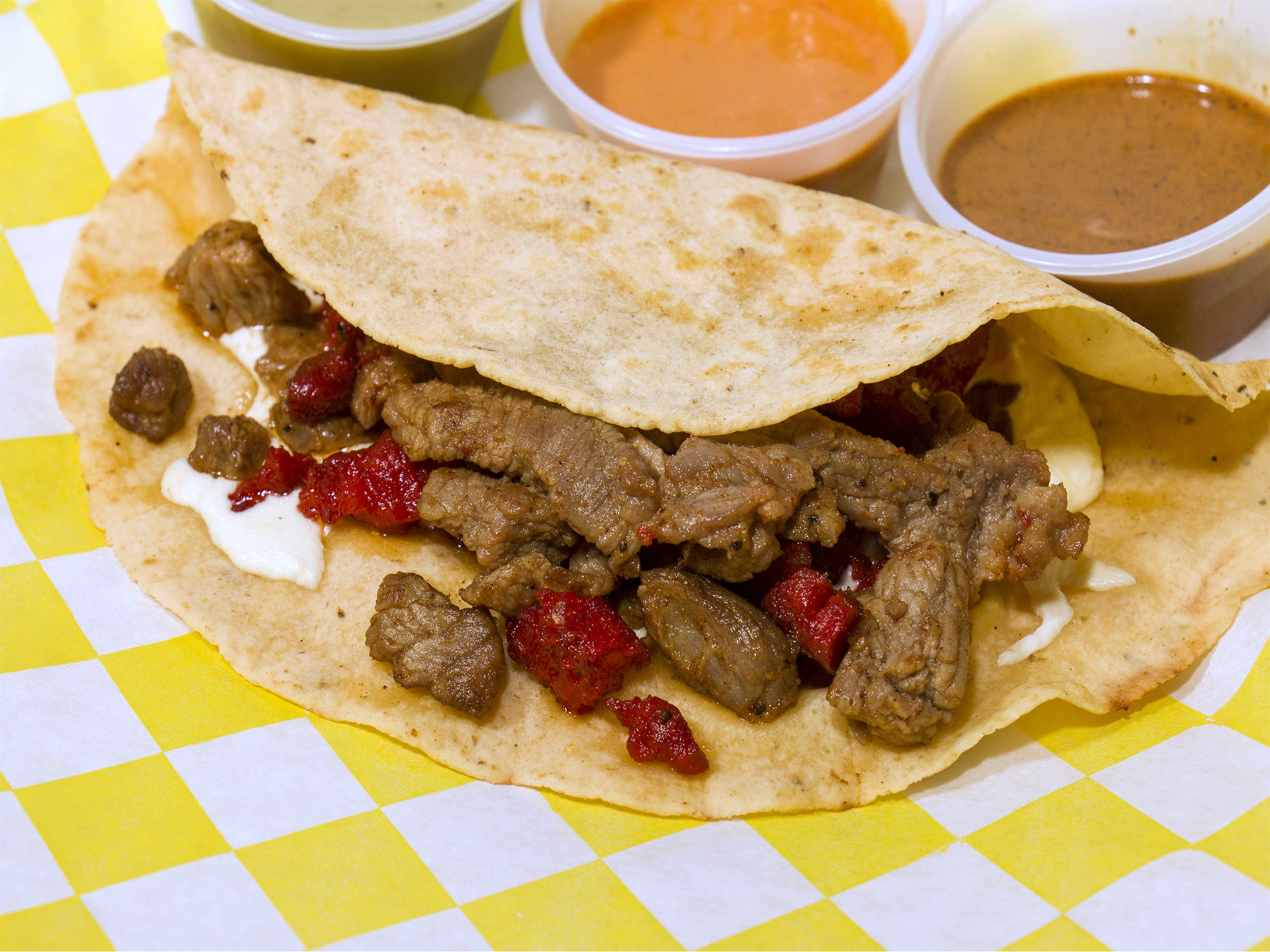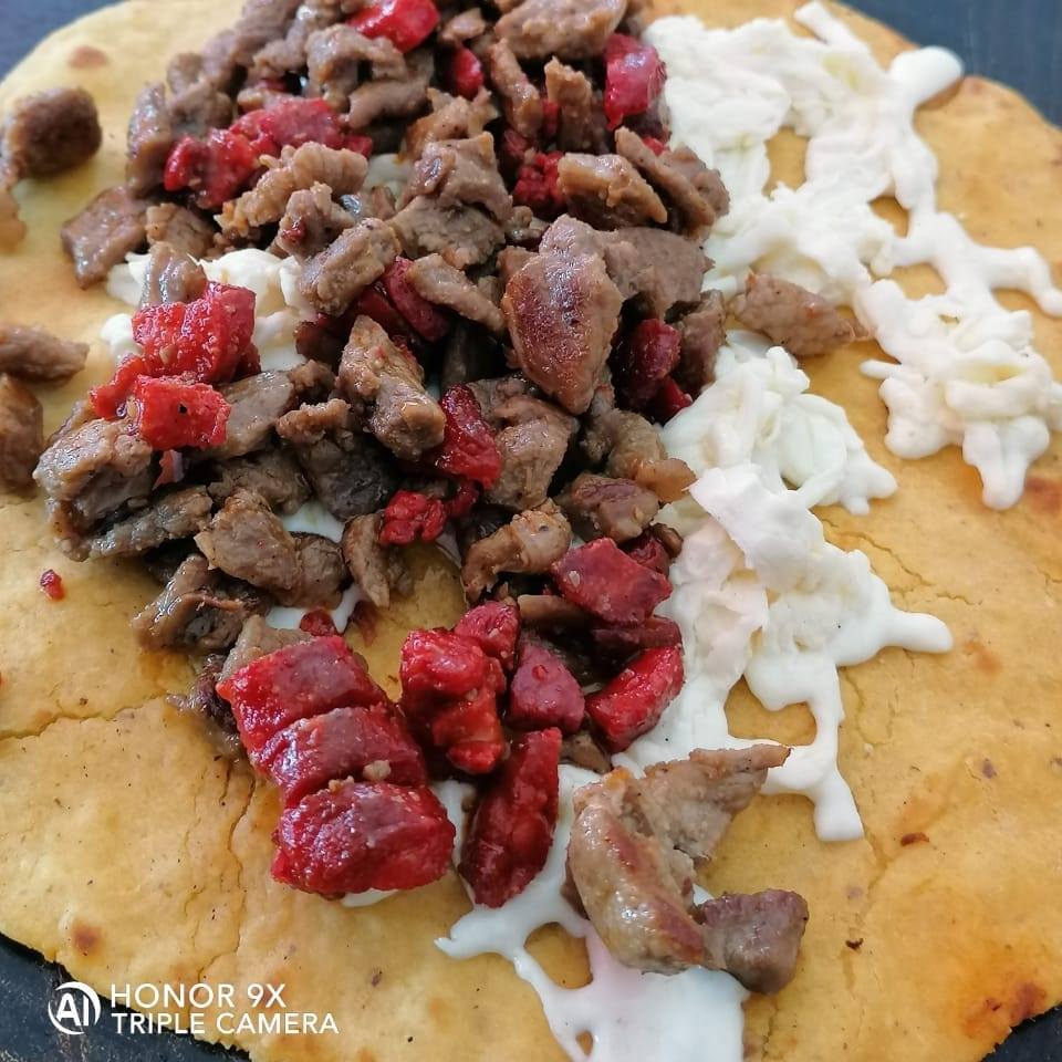 Tortilla hecha a a mano, queso de hebra y carne asada.