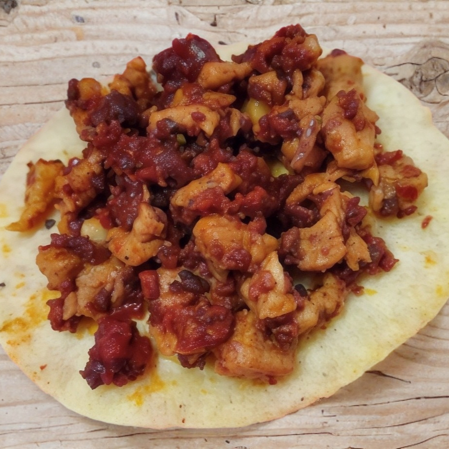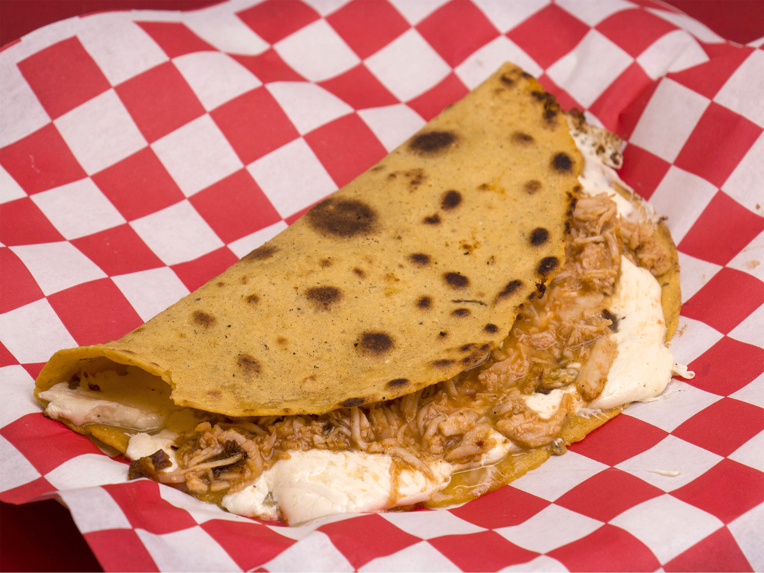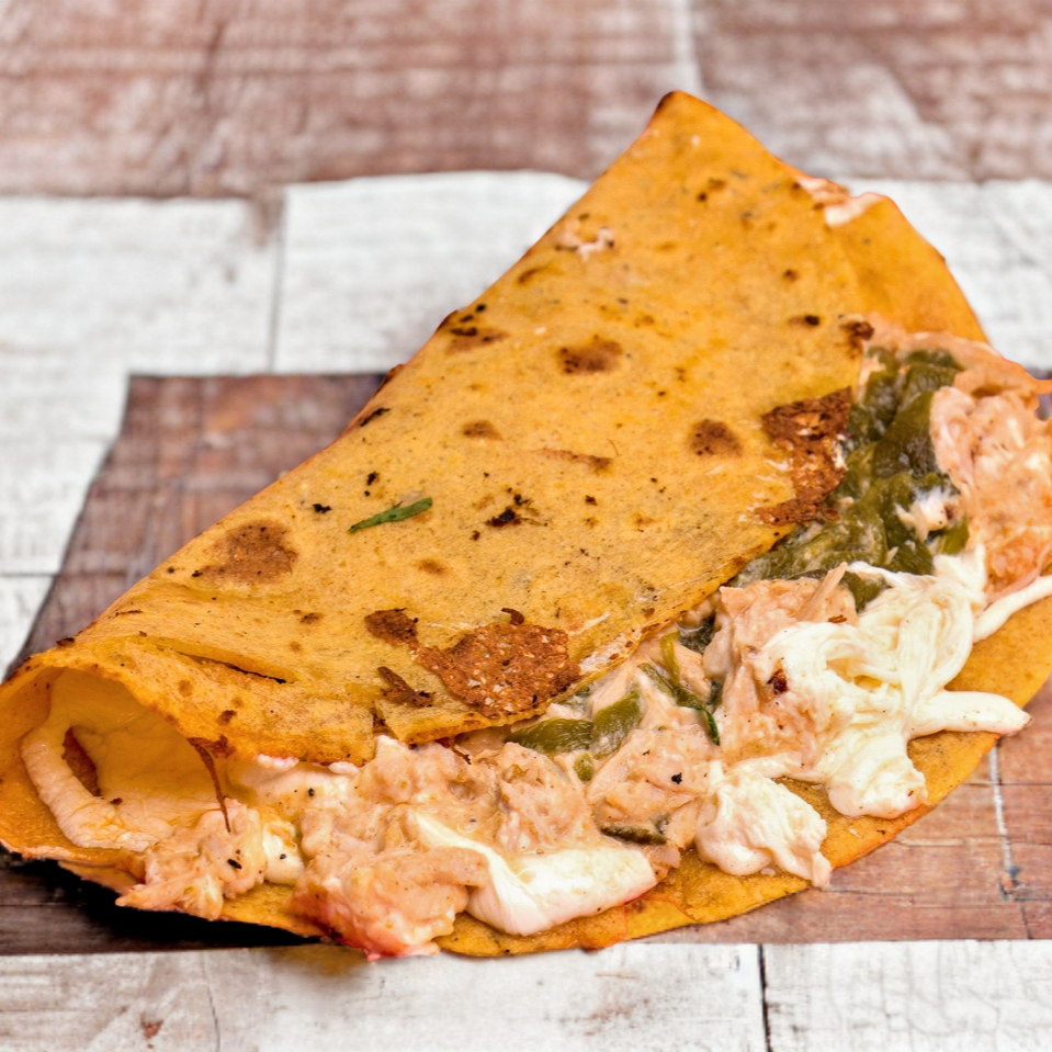 Tortilla hecha a a mano, queso de hebra y pollo.