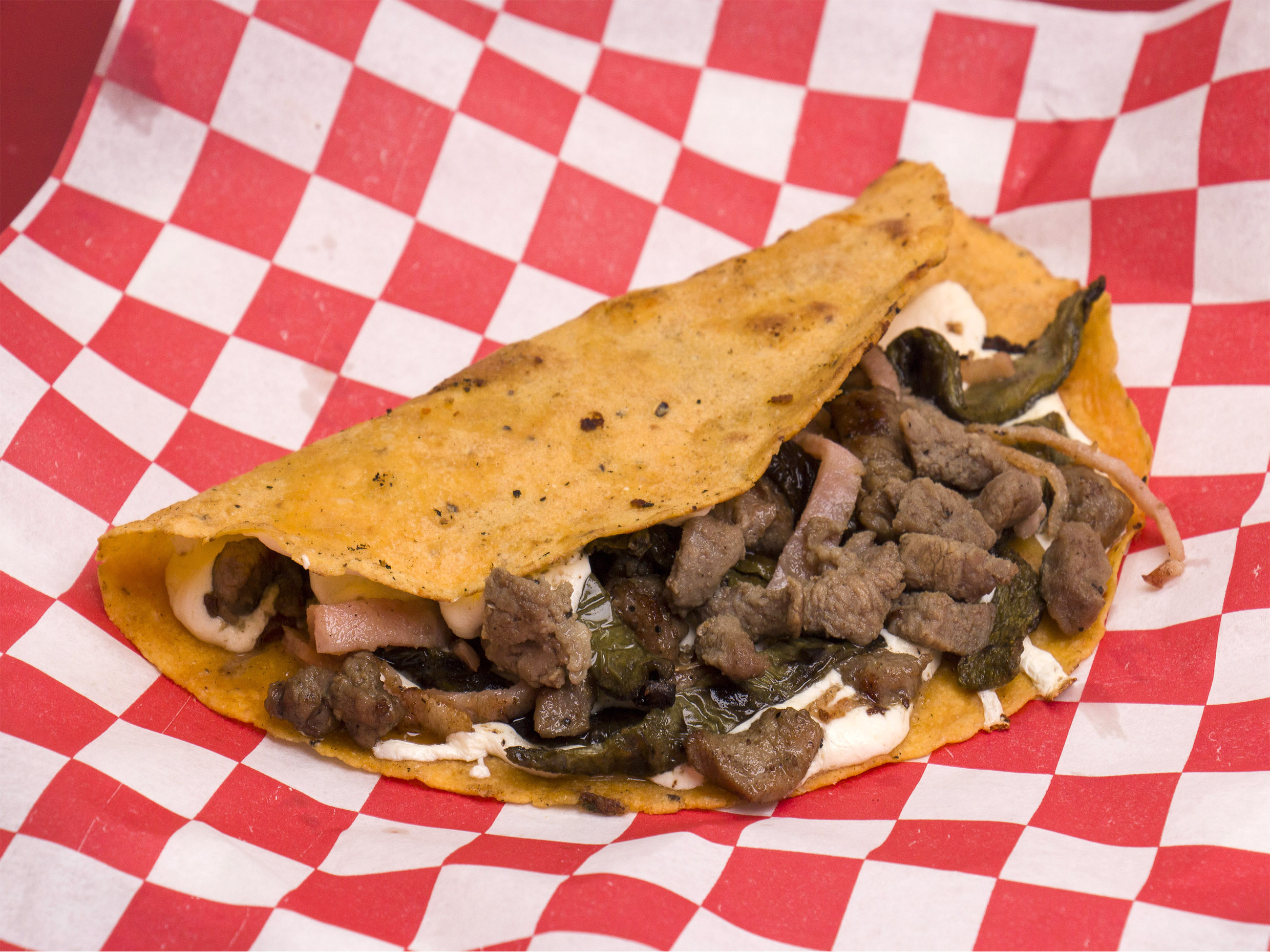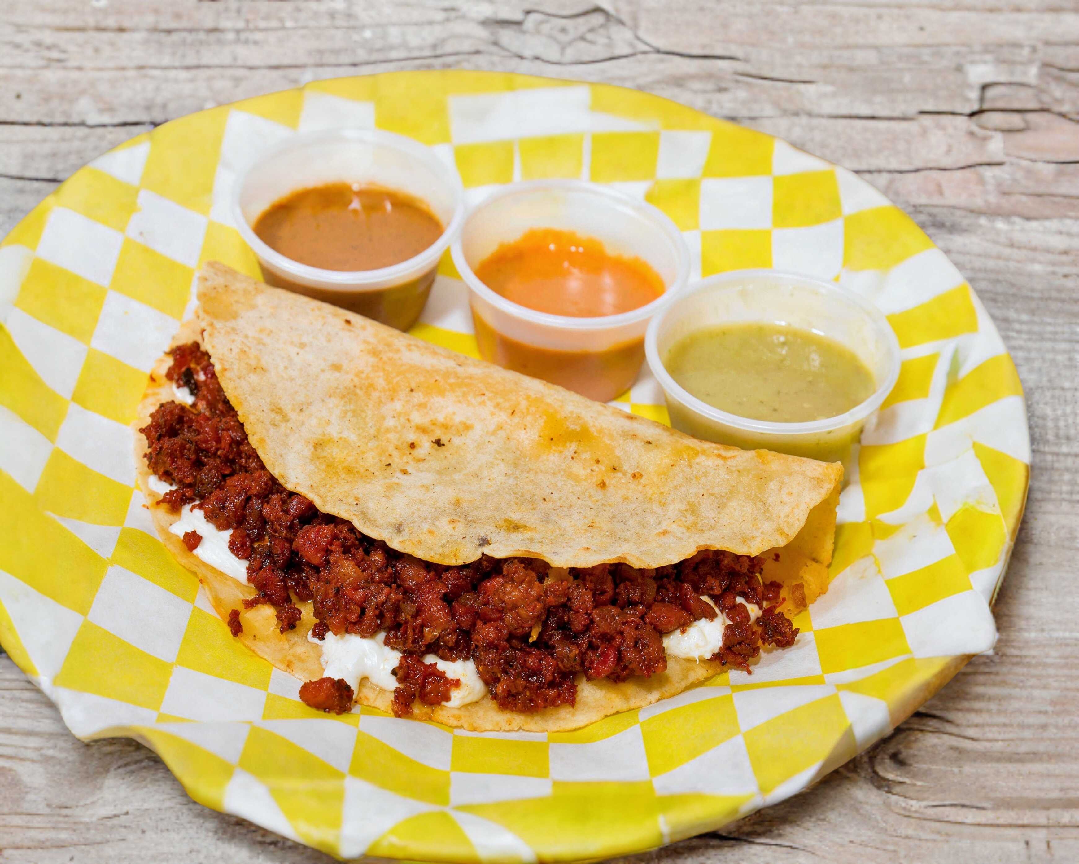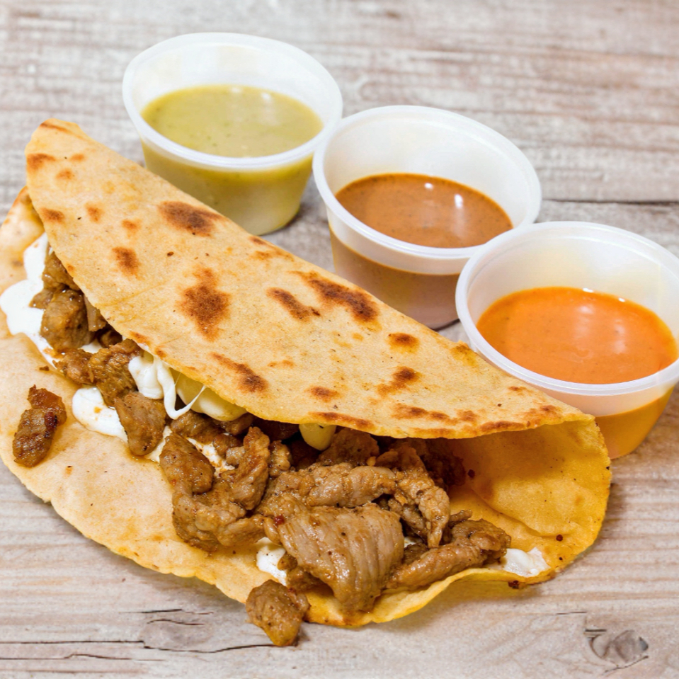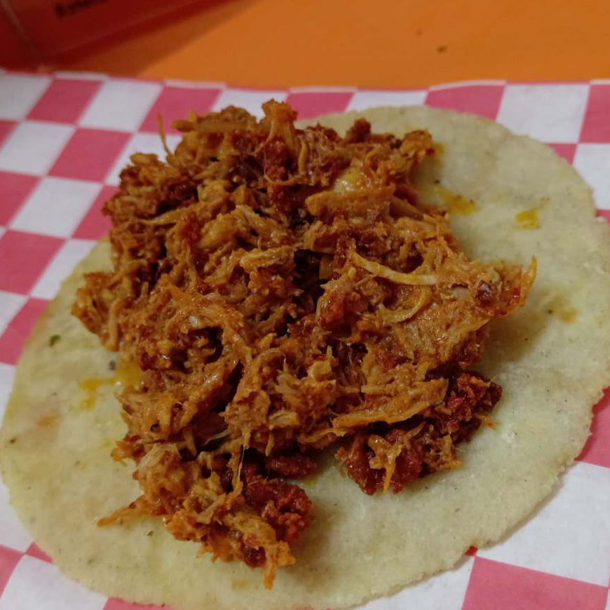 Tortilla hecha a mano, queso de hebra y carne al pastor.