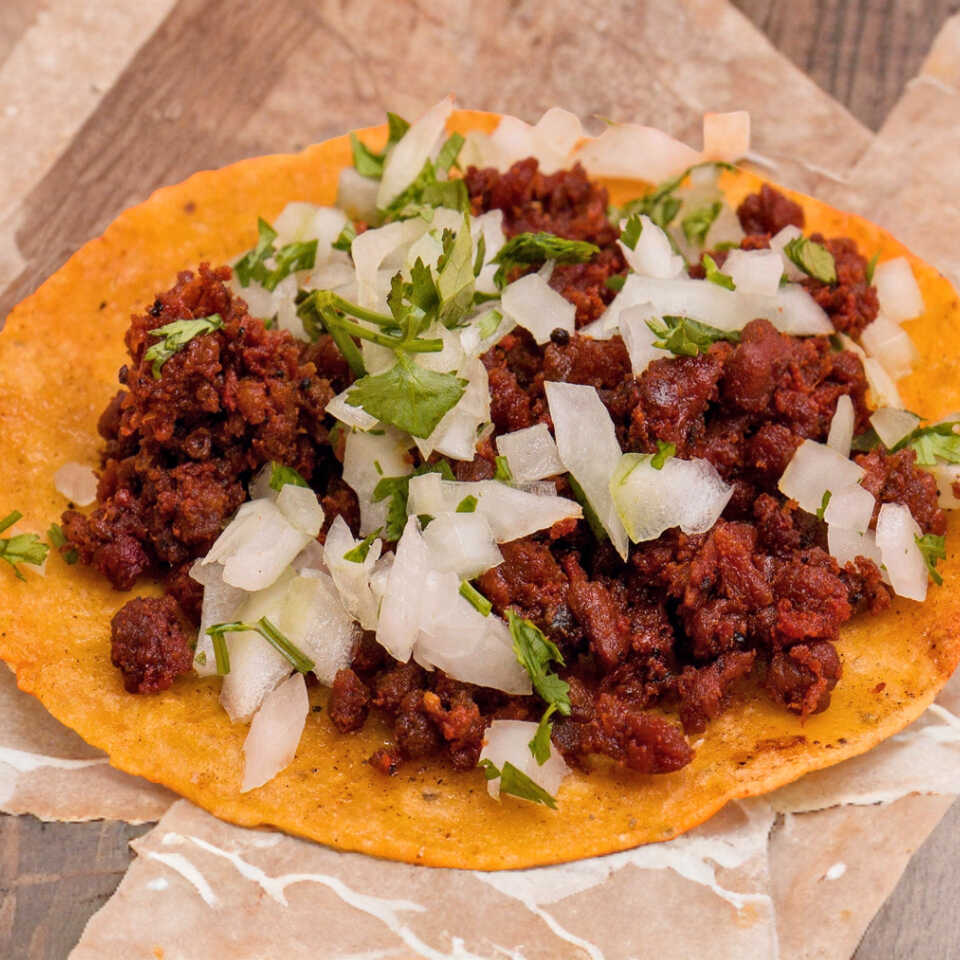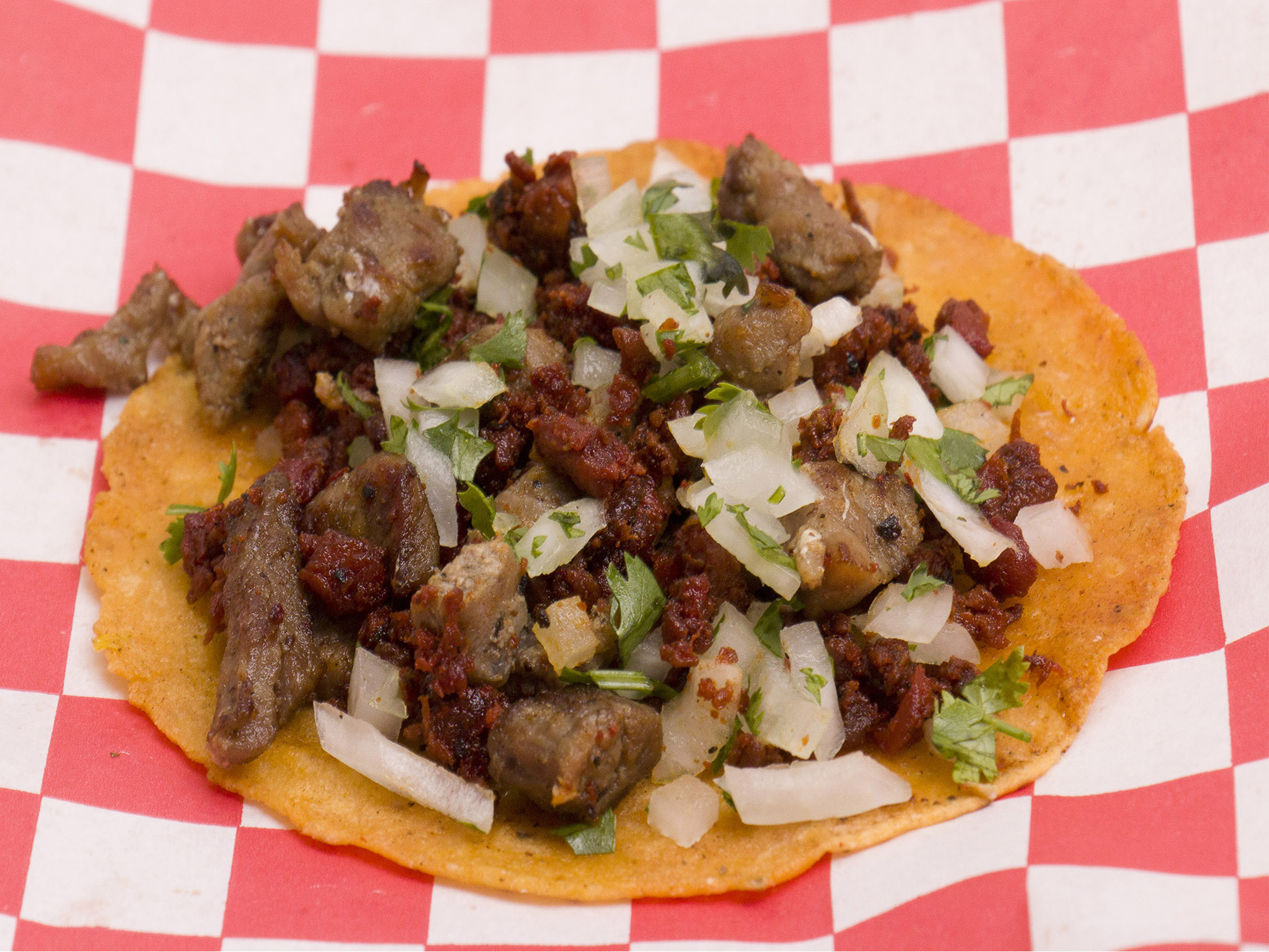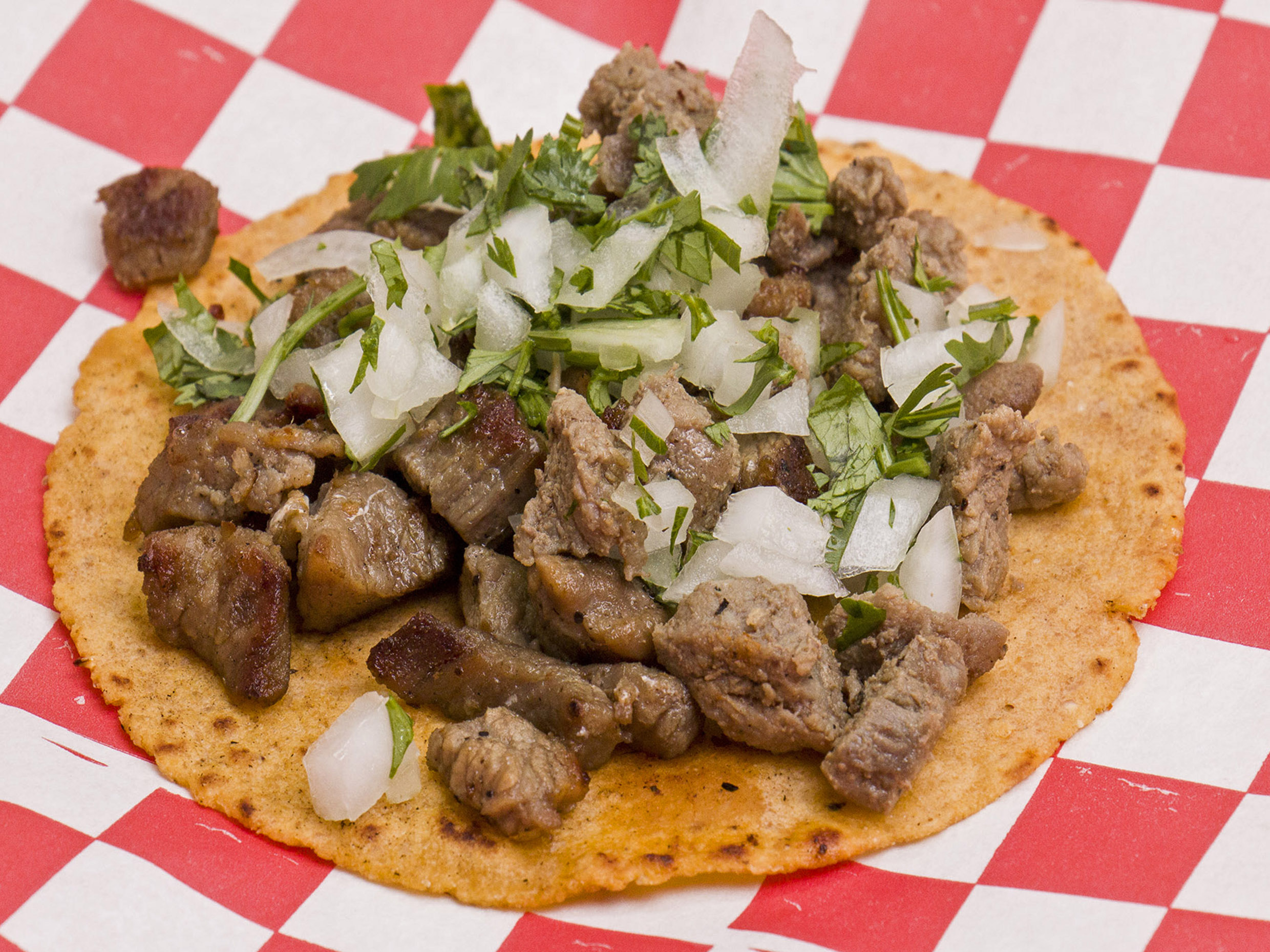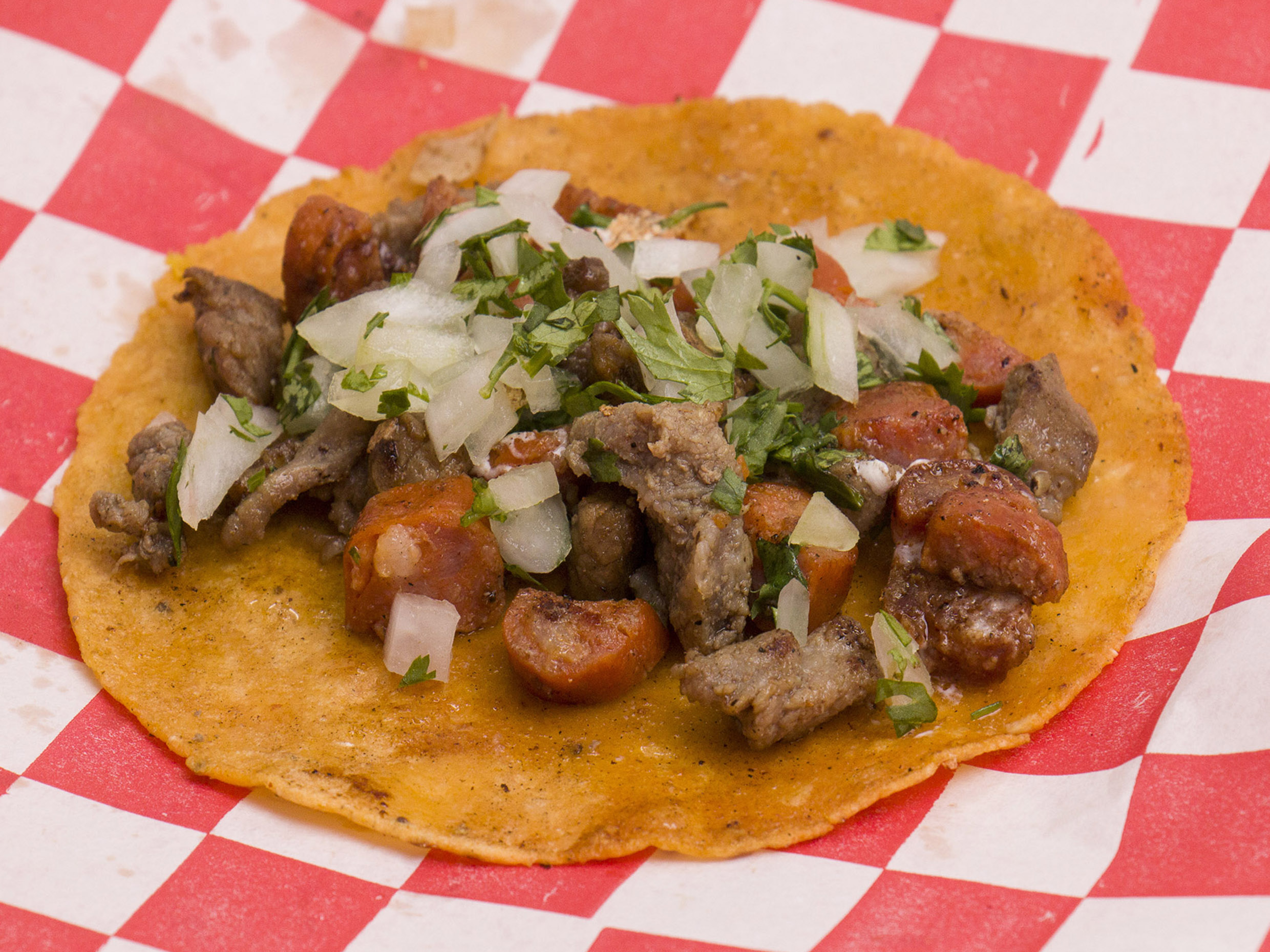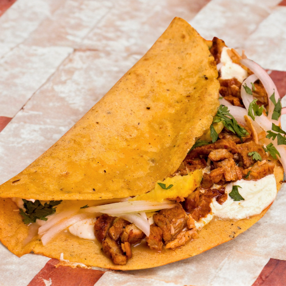 Tortilla hecha a mano, cilantro, cebolla y pastor con longaniza.