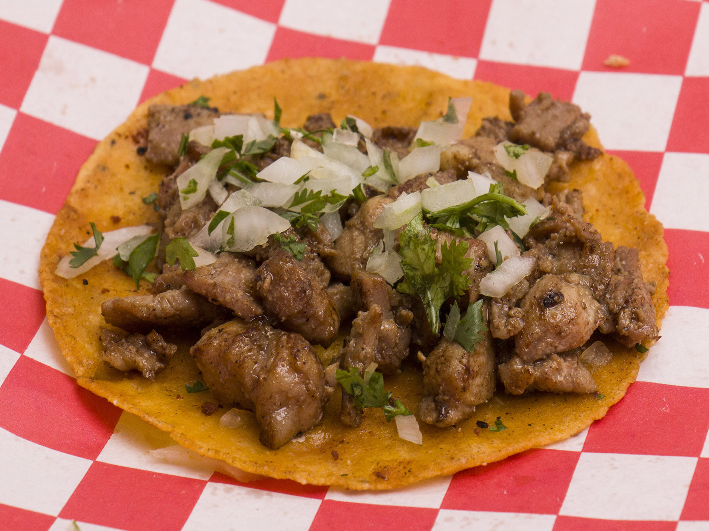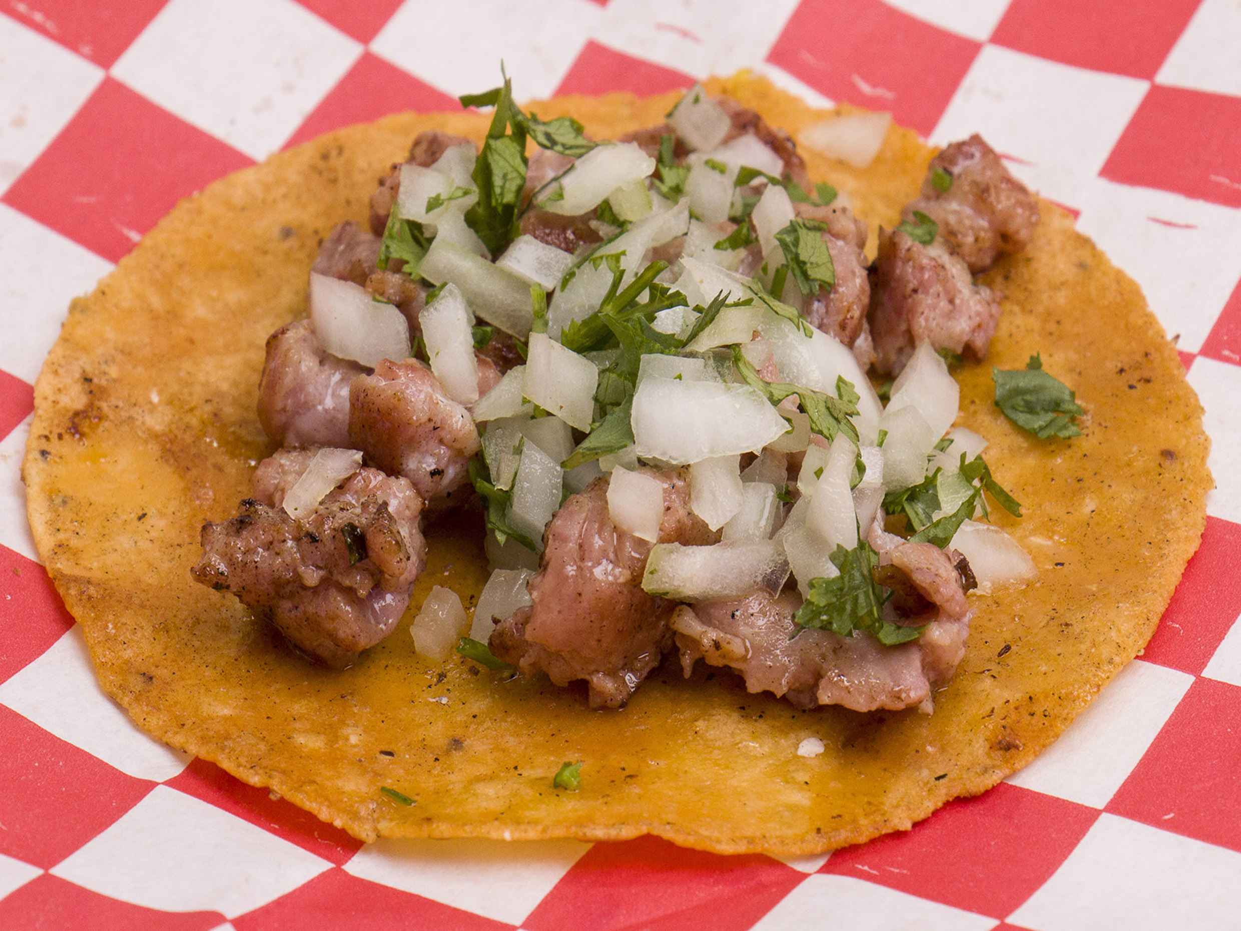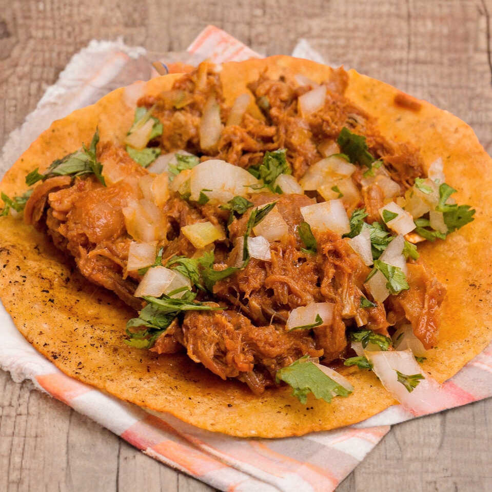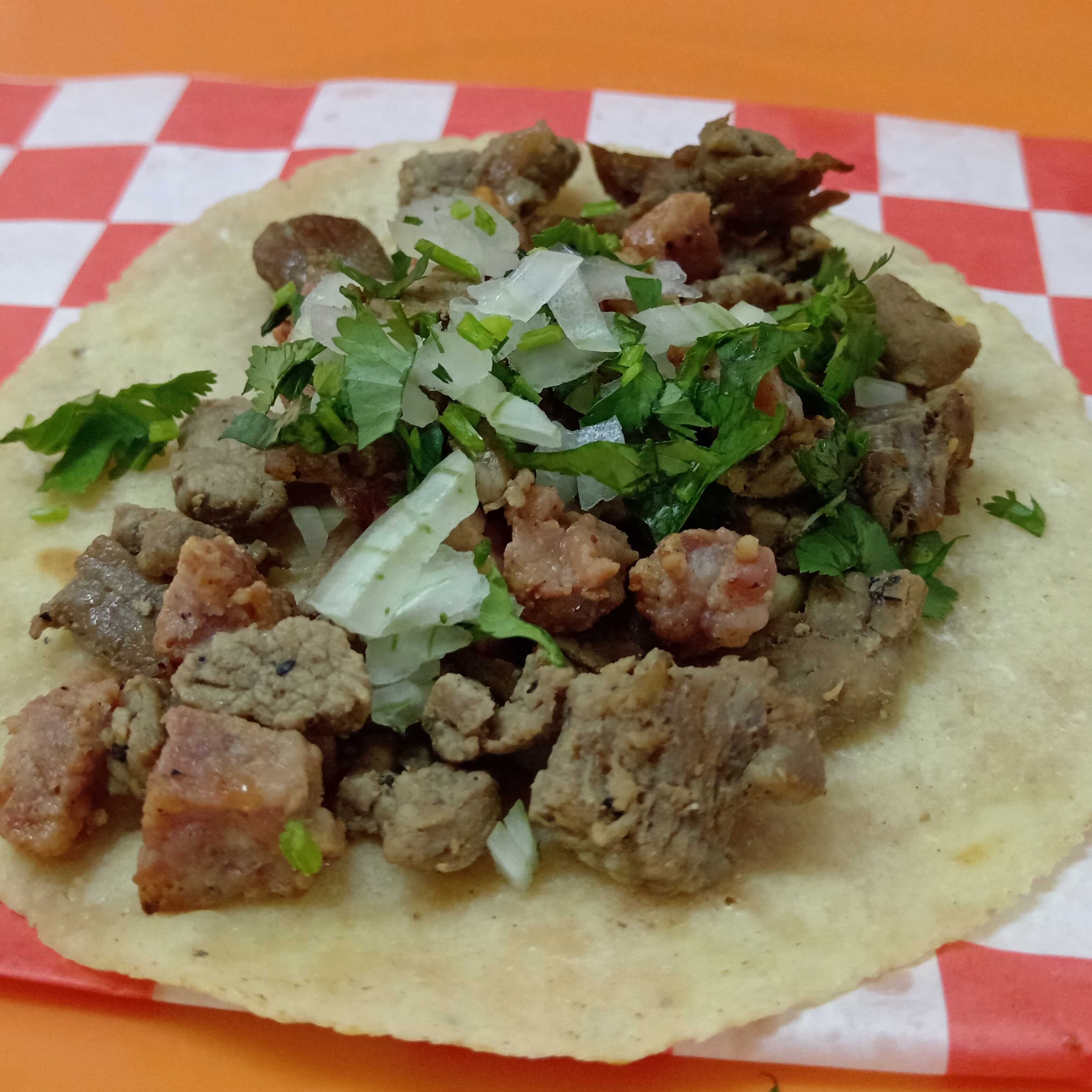 Tortilla hecha a mano, cebolla, cilantro y chicharrón prensado.