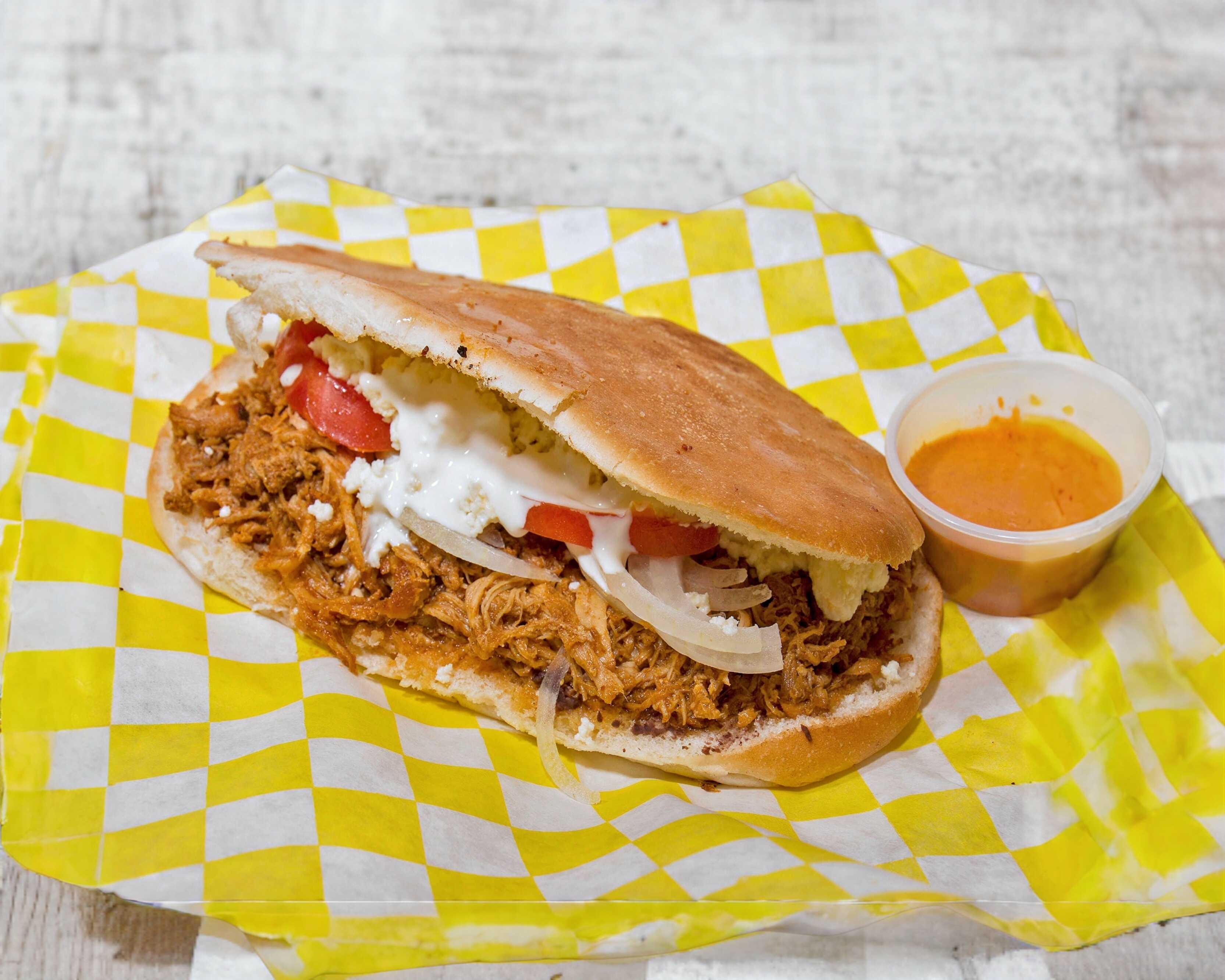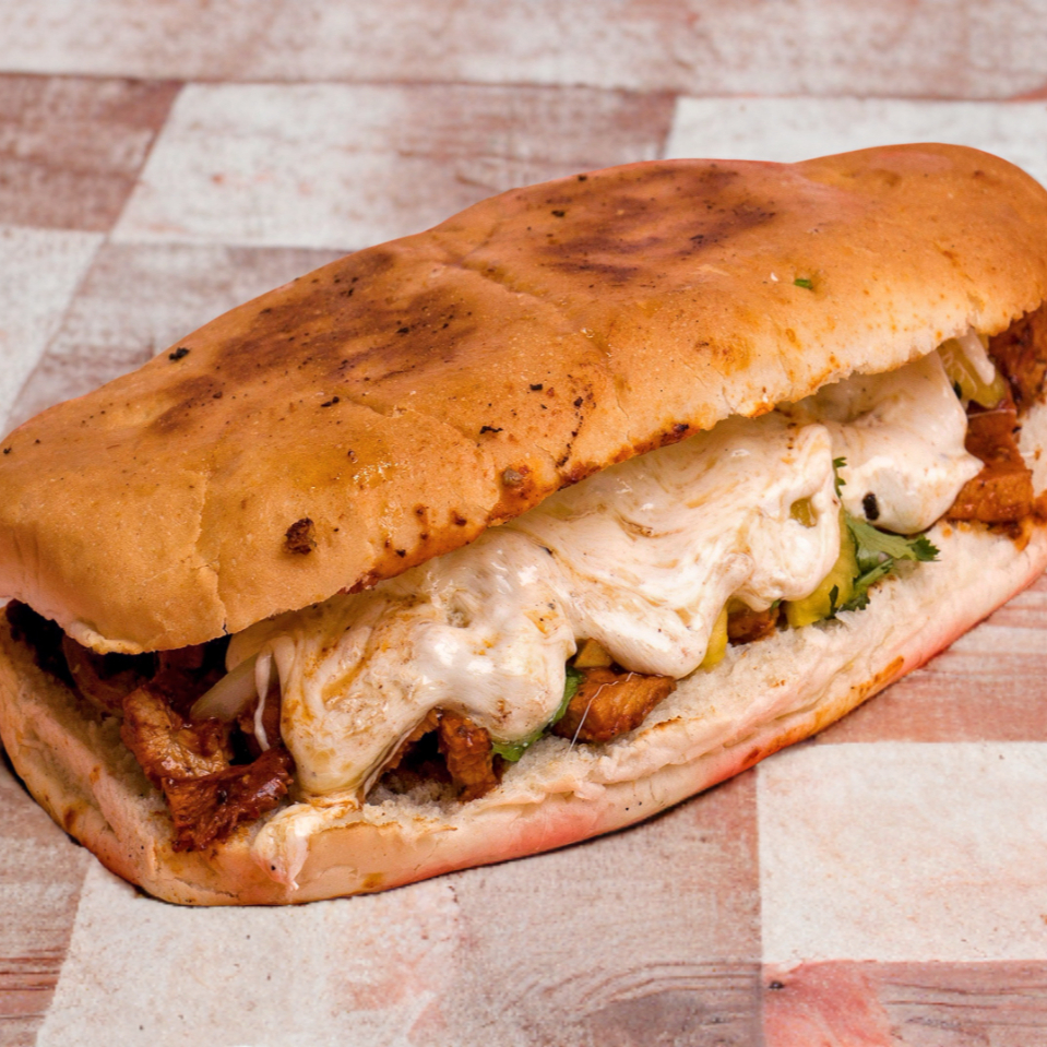Pan, frijol , mayonesa, carne al pastor, queso de hebra, cebolla y tomate.
