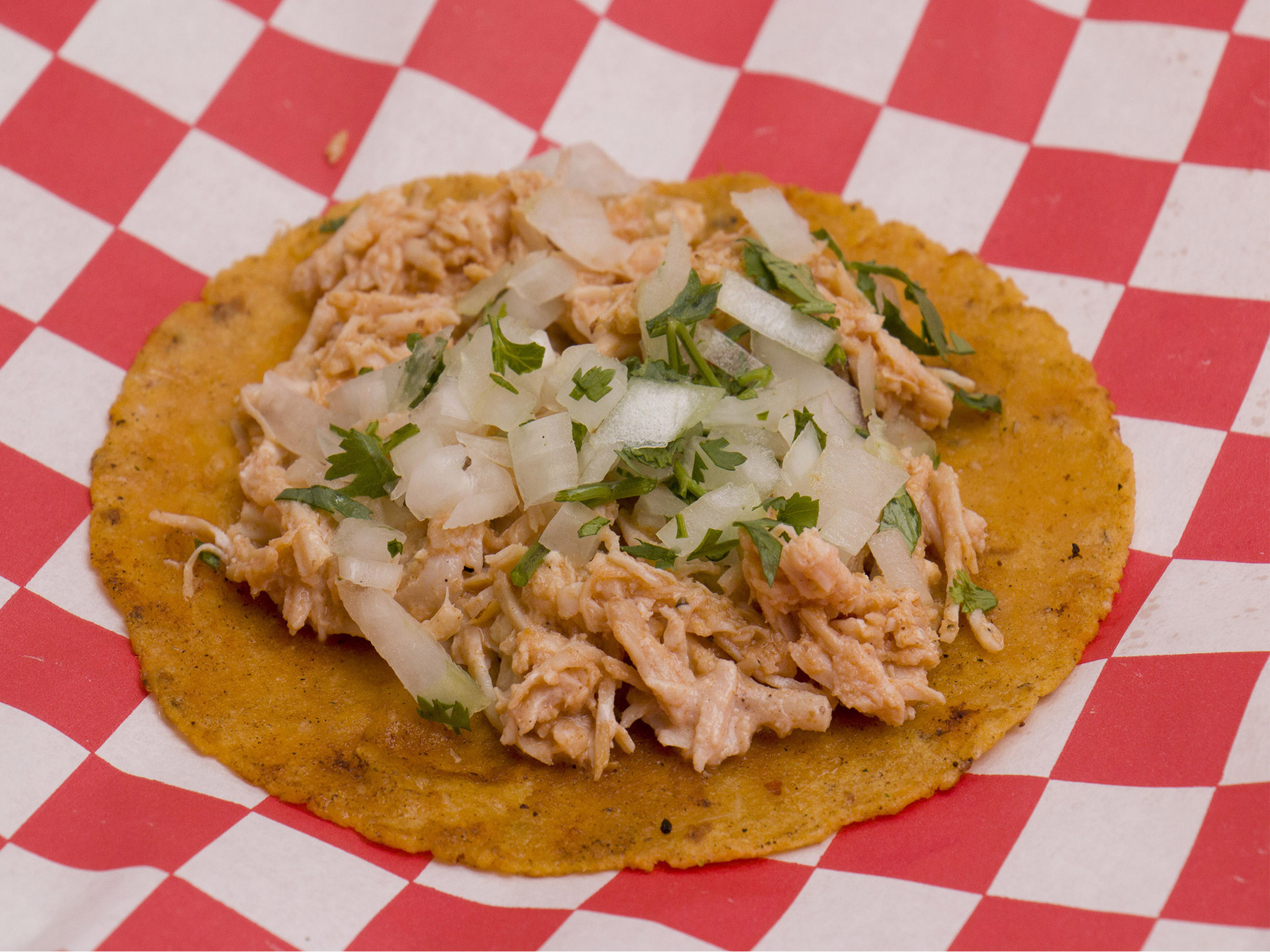 Tortilla hecha a mano, cebolla, cilantro y pollo.