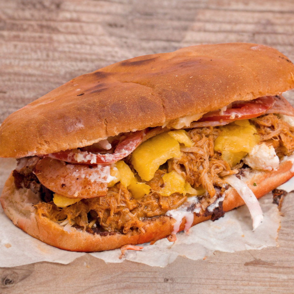 Pan, frijol, mayonesa, pierna, piña, queso de hoja, cebolla, tomate y crema.
