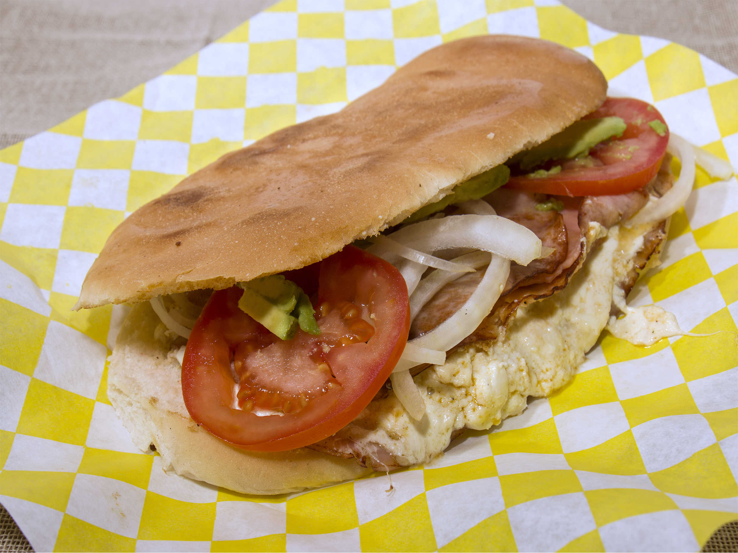 Pan, frijol, mayonesa, queso de hoja y hebra, cebolla, tomate, crema y jamón.