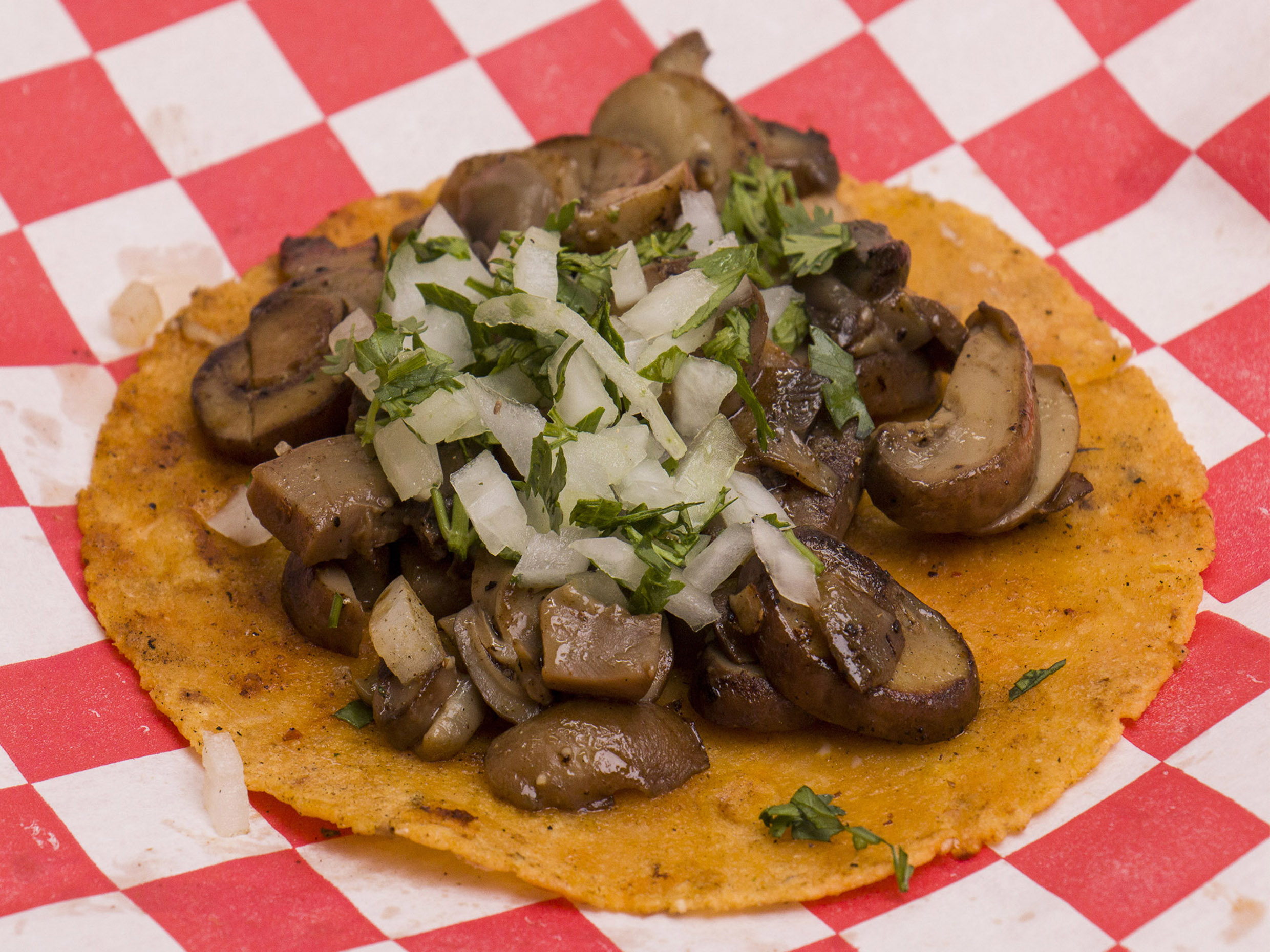 Tortilla hecha a mano, cebolla, cilantro y champiñón.