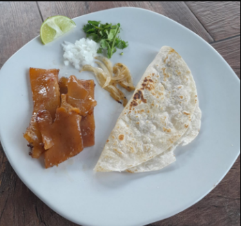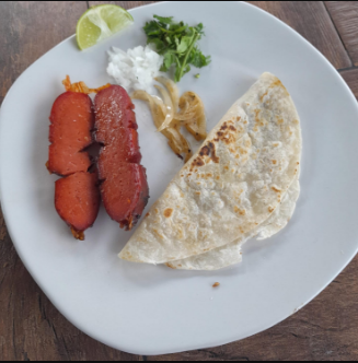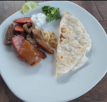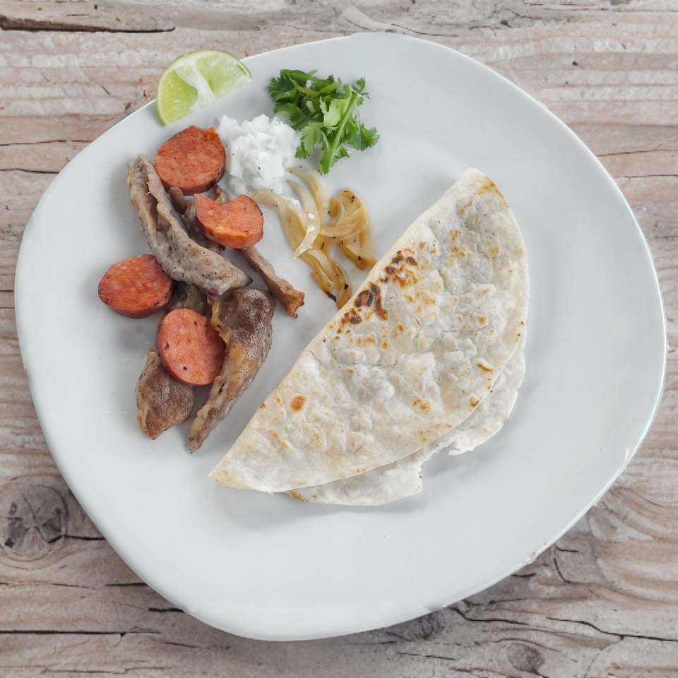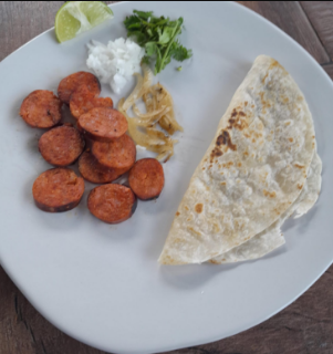 Tortilla de harina rellena asada y longaniza.