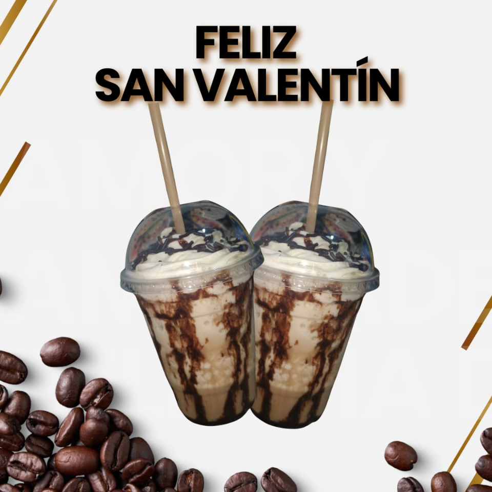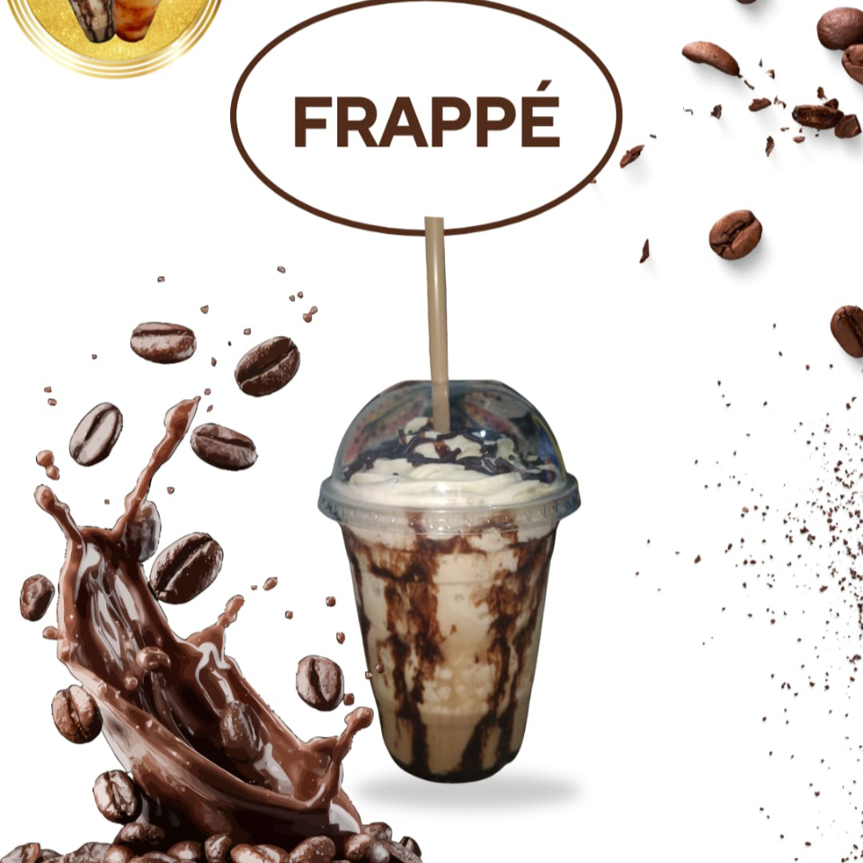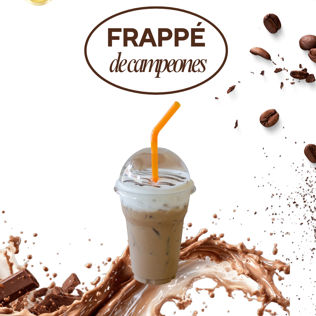 café cappuccino, leche, chocolate liquido, hielo, azúcar, crema chantilly y chispas de chocolate o arcoiris