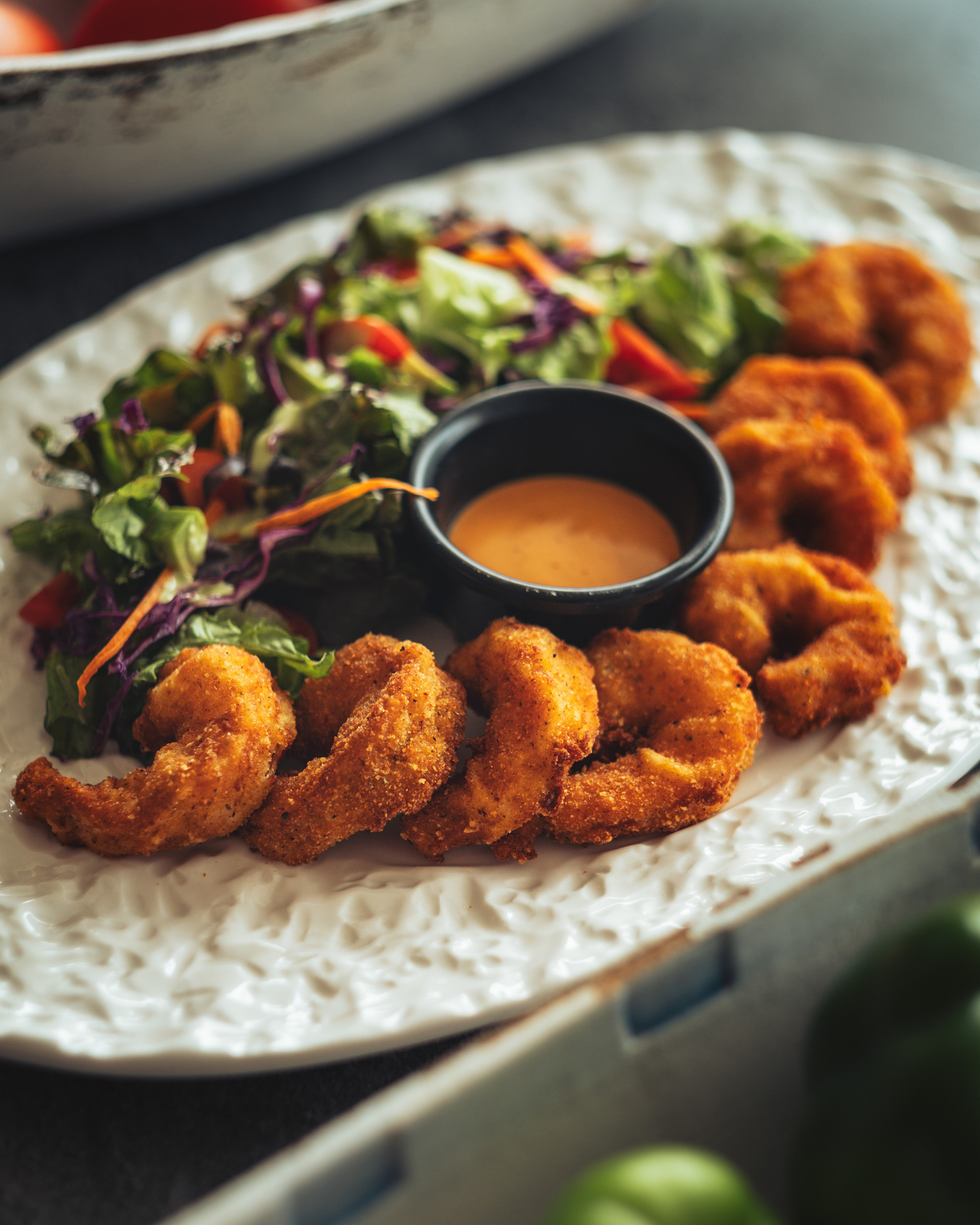 Con pan molido de la casa. Acompañados con ensalada de lechuga sangría, col morada, tomate cherry, aguacate y aderezada con vinagreta de cilantro criollo
