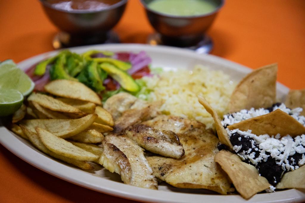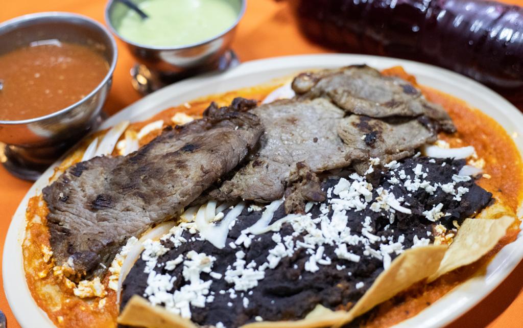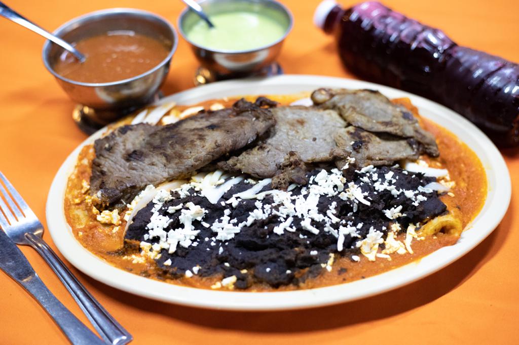 Tortillas hechas a mano bañadas de salsa picante o sin picante acompañadas de frijoles sirloin, cesina o pechuga e pollo