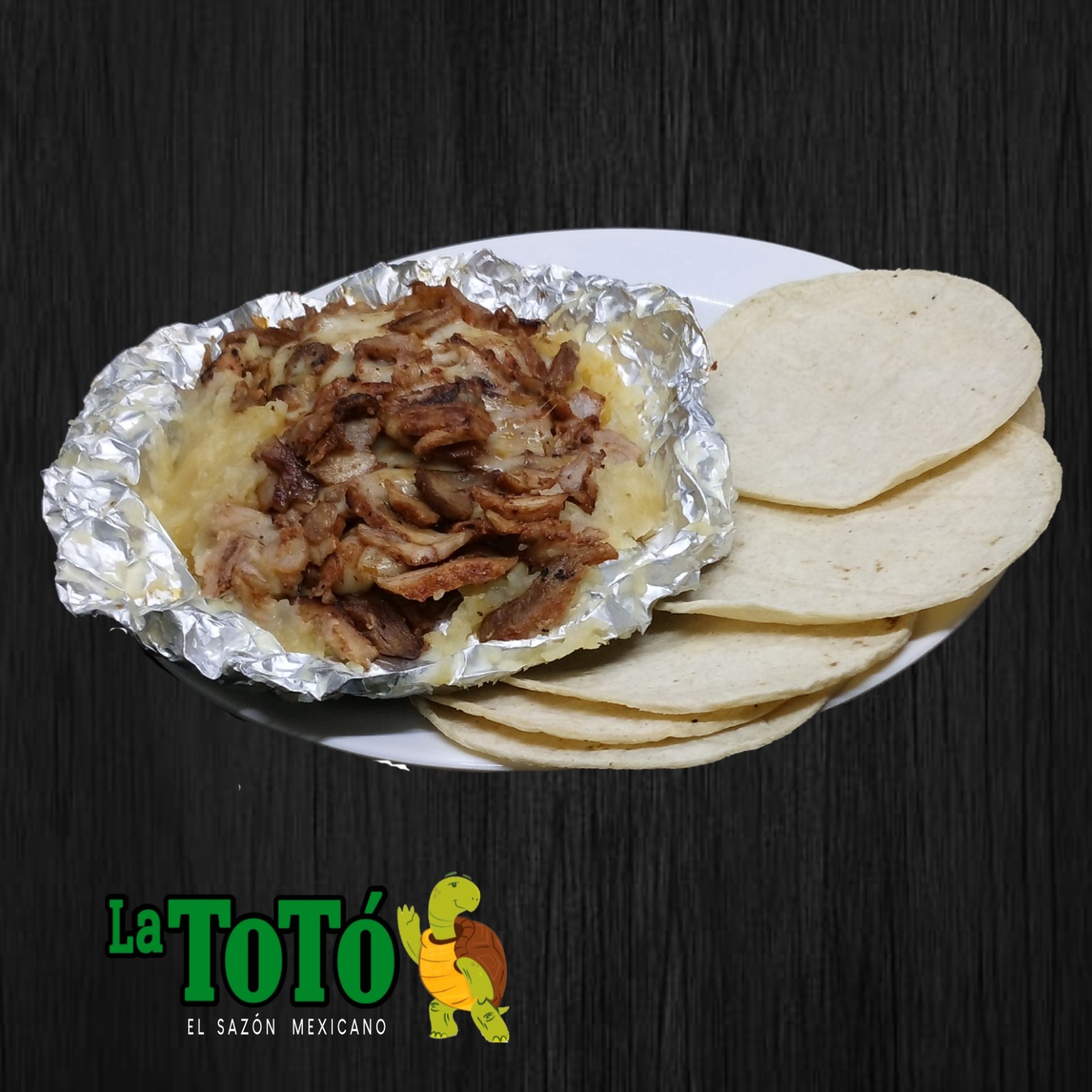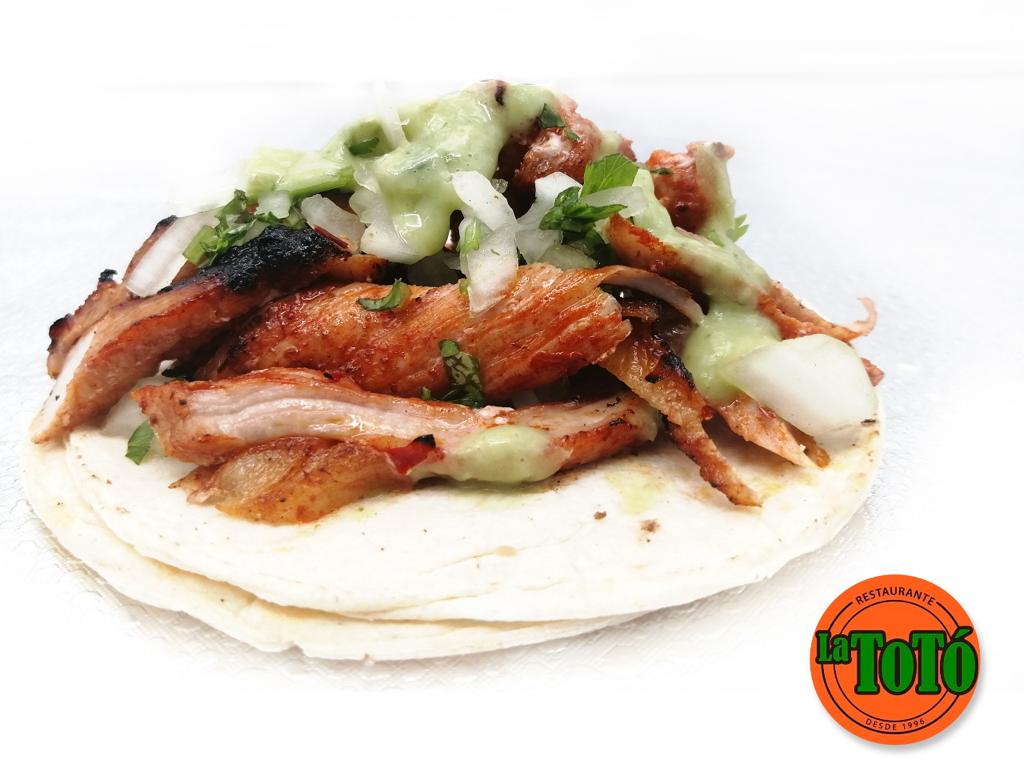 Carne al pastor acompañada tortilla, salsas, cilantro, cebolla asada, papas cambray.
