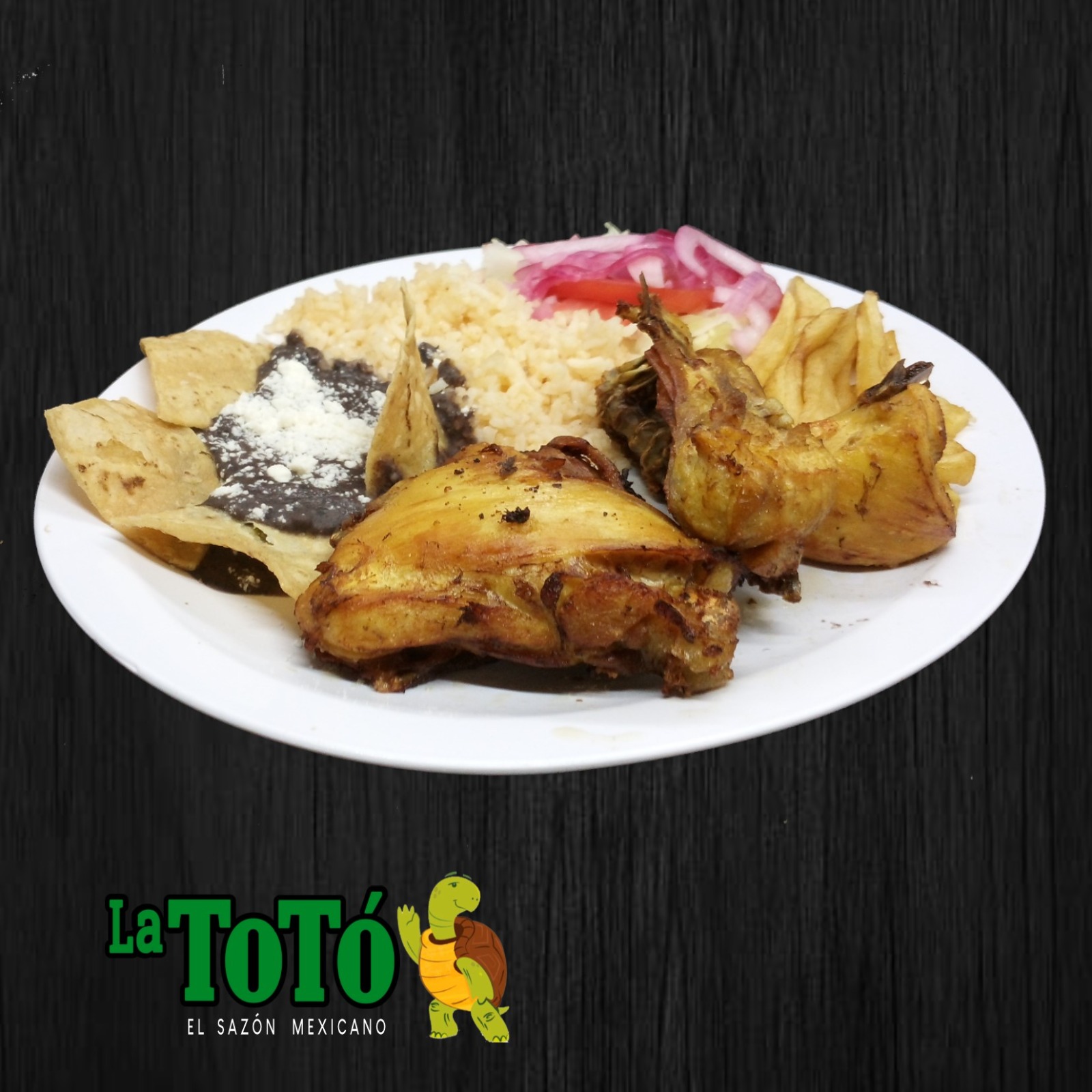 Acompañada de arroz, frijoles, ensalada y papas.