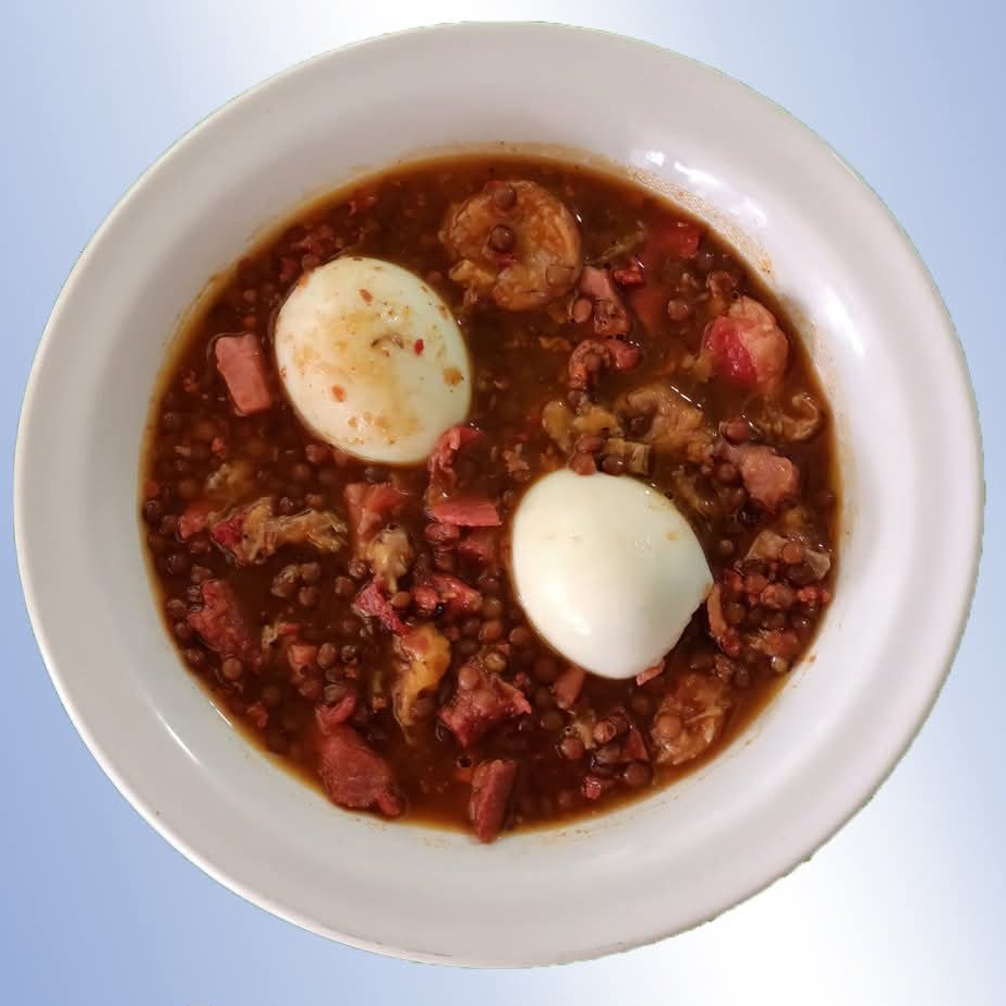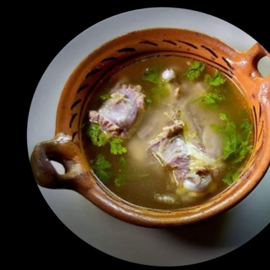 Caldo de Lentejas con Fabada, Carne salada, Longaniza y Tocino. Incluye tortillas, totopos, cebolla y salsa