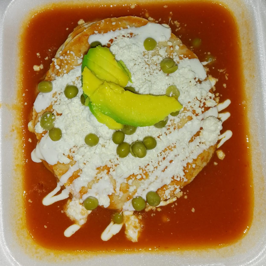 Orden De 2 Huevos con Tortilla, Frijoles, Jamón, Salsa y decorado con crema, queso, chicharos y aguacate, acompañado de platanitos fritos