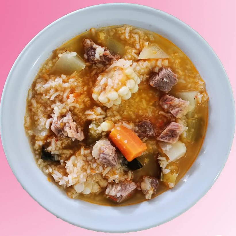Carne de res picada con arroz y verduras (chayote, calabaza criolla, zanahoria, Elote). Incluye tortillas, totopos, cebolla y salsa