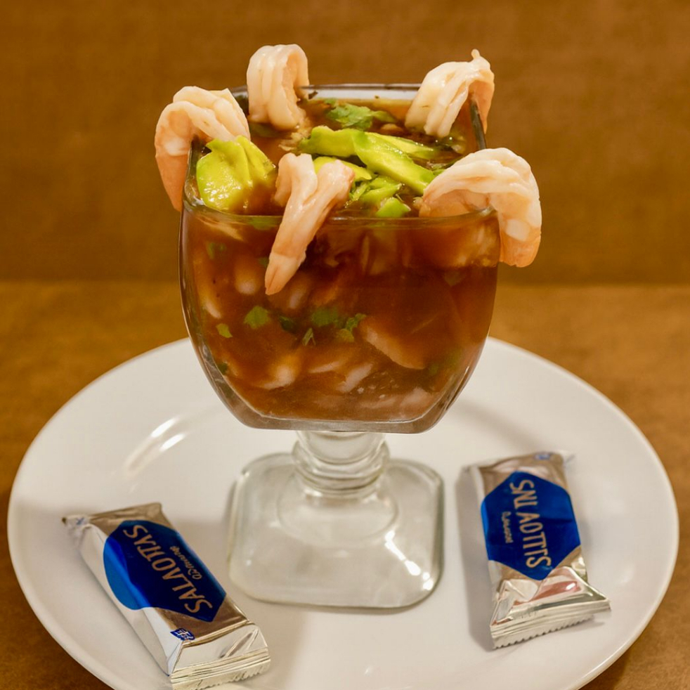 Coctel Grande de Camarón de Mar con Cebolla, Cilantro, Salsa especial y Galletas Saladas.