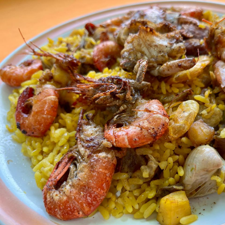 Orden de Paella para 2 personas. Incluye Camarón de Mar, Pollo, Chorizo Argentino, Costilla de Cerdo, Almeja blanca en Arroz, decorado con Camarón de Río y Jaiba en Concha