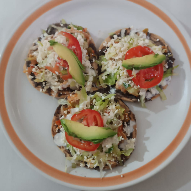 Pieza de Tostada de Pollo guisado con base de frijol negro y decorado con lechuga, tomate, aguacate, crema y queso
