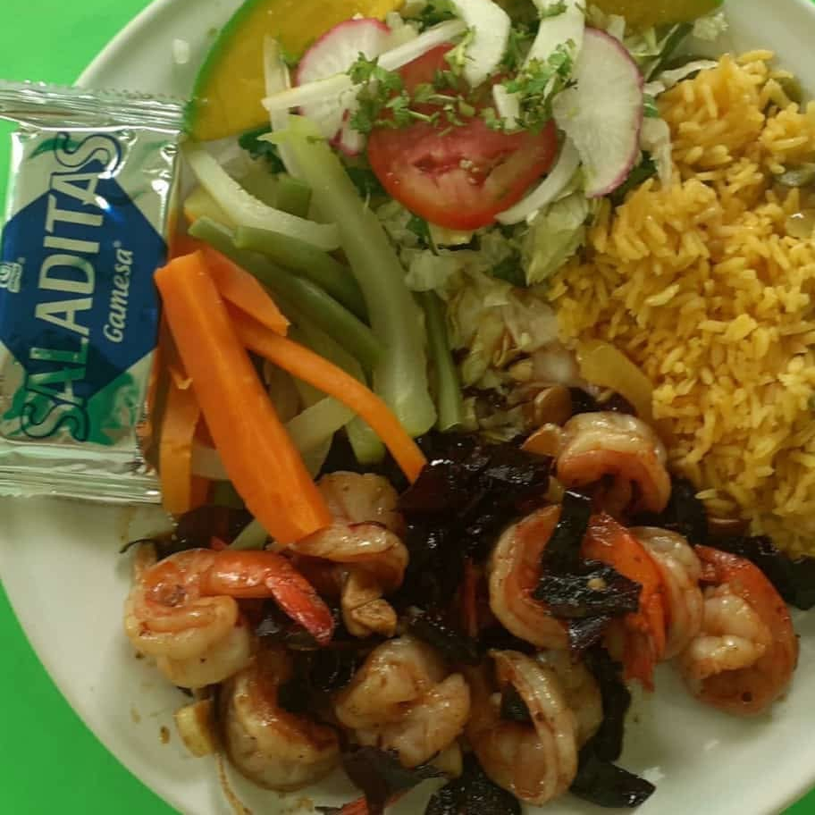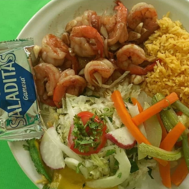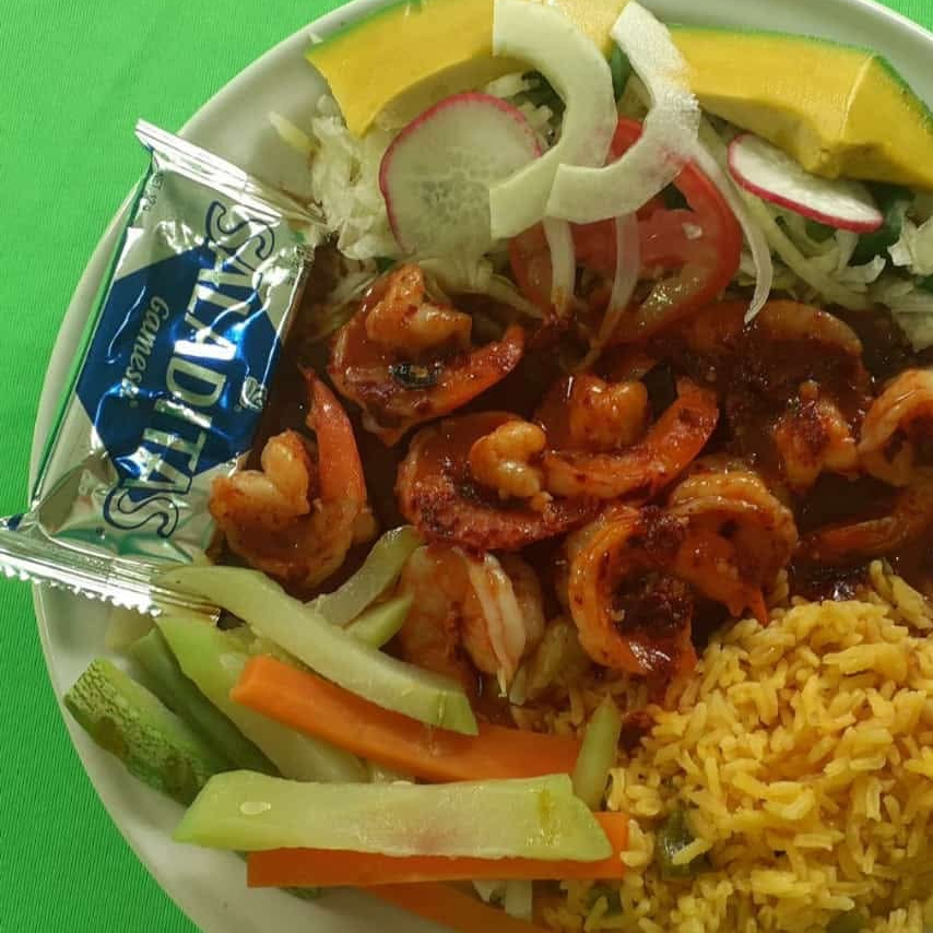 Camarones en preparación de salsa de mantequilla. Acompañado de una guarnición de ensalada, verduras cocidas y arroz. Lleva de complementos Galleta salada y totopos