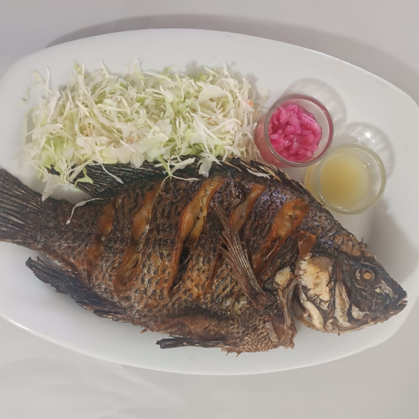 Mojarra Carpa de 1 Kg Frita acompañada de ensalada de Repollo, Cebolla, Salsa, Tortillas y Totopos