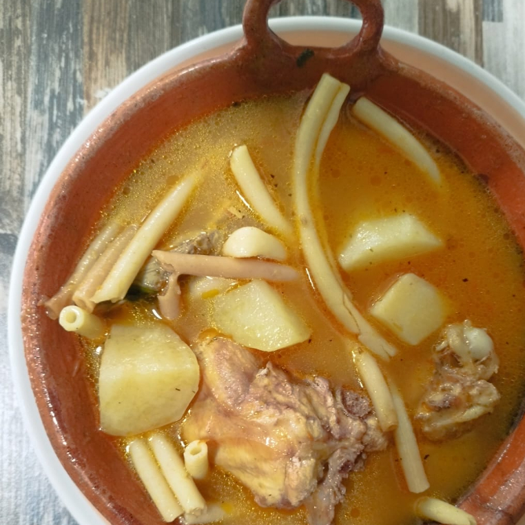 Caldo de Pollo con Pasta de Macarrón y papas con su pieza de pollo. Incluye tortillas, totopos, cebolla y salsa