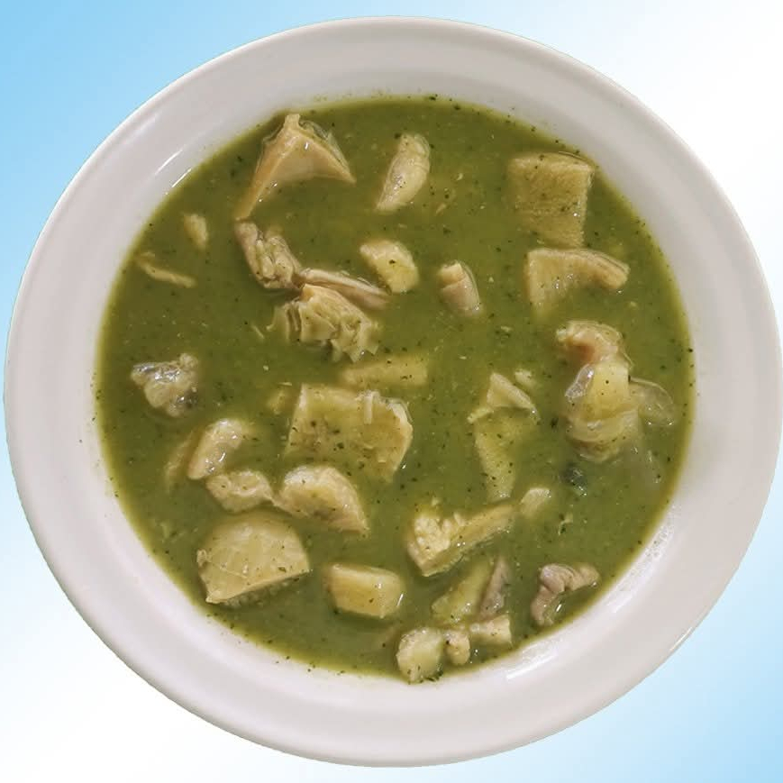 Mondongo en caldo verde con condimentos y hierbas tabasqueños. Incluye tortillas, totopos, cebolla y salsa