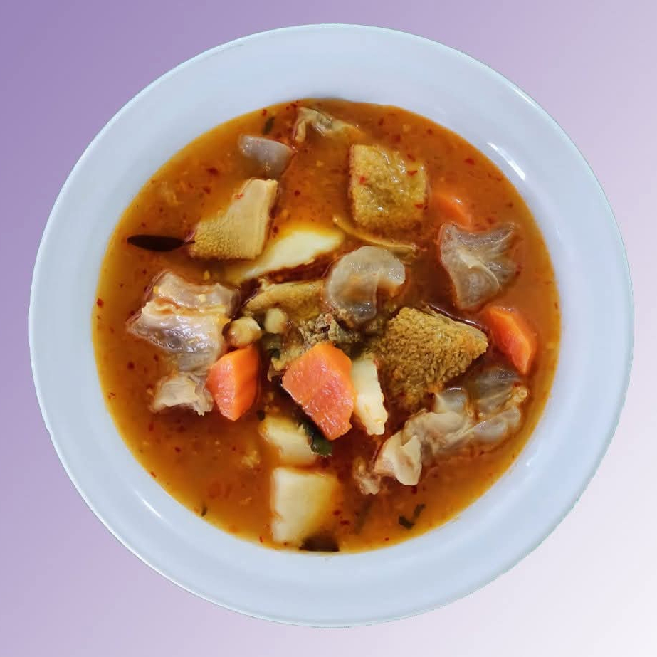 Mondongo con papa, zanahoria y garbanzo en caldo rojo. Incluye Tortillas, totopos, cebolla y salsa
