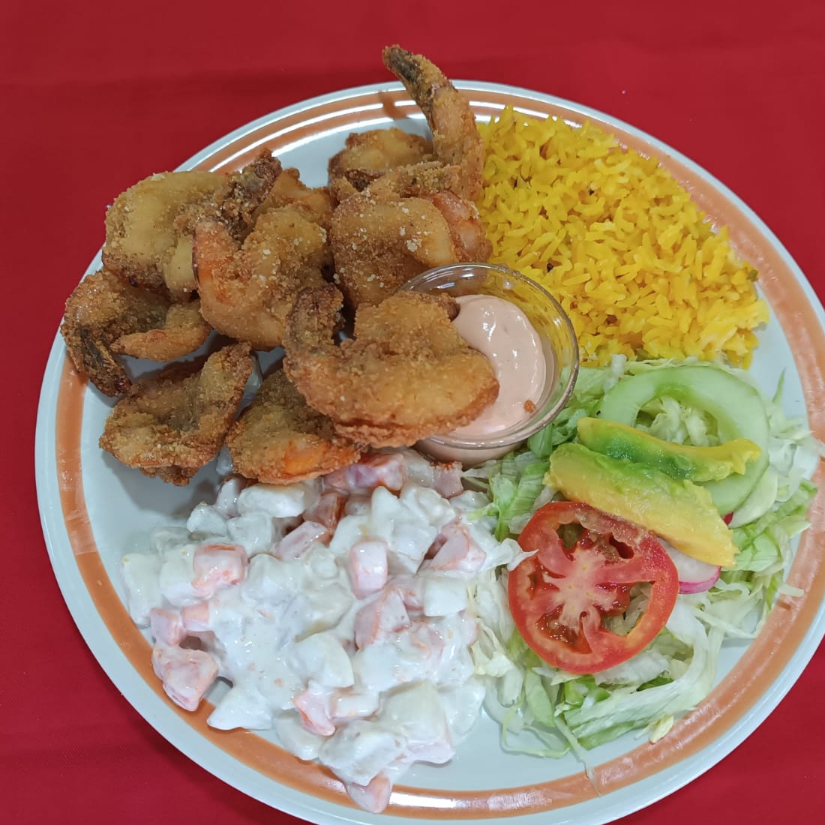 camarones empanizados con una guarnición de ensalada, verduras cocidas y arroz. Lleva de complementos Galleta salada y totopos