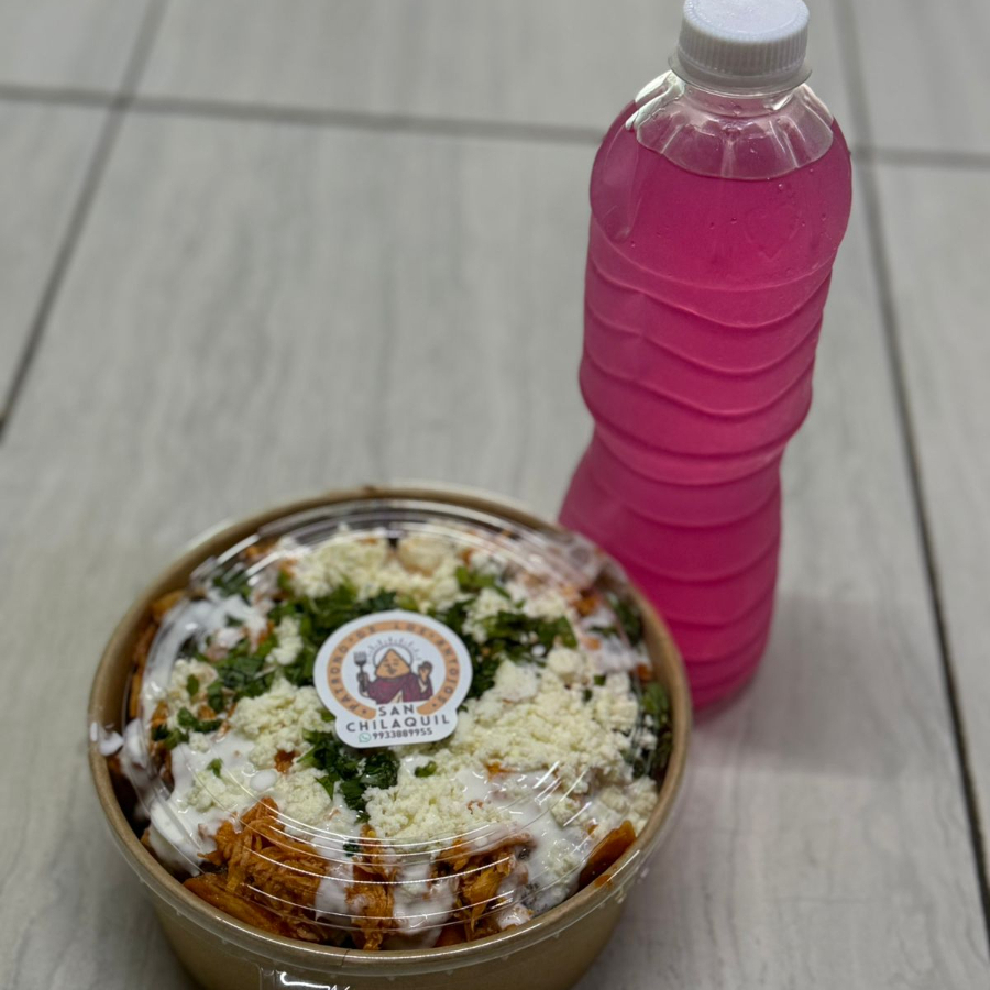Incluye Chilaquiles grandes y refresco o agua fresca que prefieras