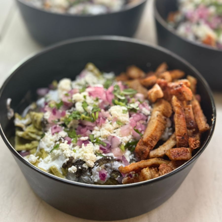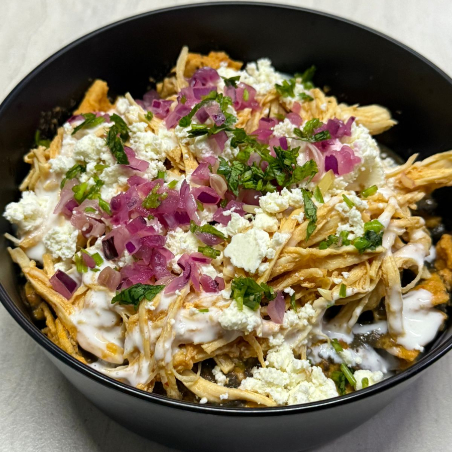 Deliciosos chilaquiles con la proteína(45grs) que elijas, totopos (65gr), salsa que elijas (4oz), frijoles (1 oz), queso doble crema, cebolla morada, crema y fresco cilantro. escoge el picor que mas te guste.